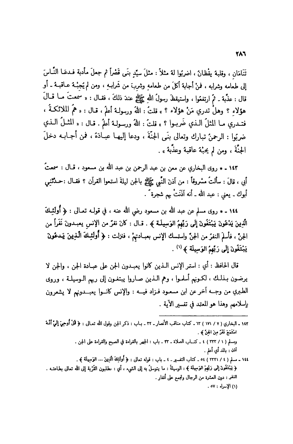 144 - * روى مسلم عن عبد الله بن مسعود رضي الله عنه، في قوله تعالى: {أُولَئِكَ الَّذِينَ يَدْعُونَ يَبْتَغُونَ إِلَى رَبِّهِمُ الْوَسِيلَةَ}. قال: كان نفرٌ من الإنس يعبدون نفراً من الجن، فأسلم النفرُ من الجن واستمسك الإنس بعبادتهم، فزلت: {أُولَئِكَ الَّذِينَ يَدْعُونَ يَبْتَغُونَ إِلَى رَبِّهِمُ الْوَسِيلَةَ} (1).