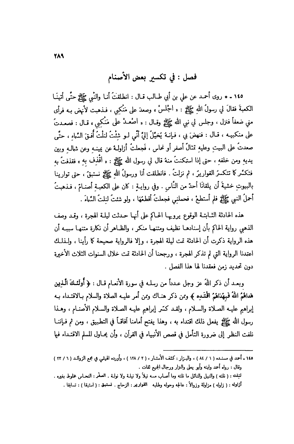 145 - * روى أحمد عن علي بن أبي طالب قال: انطلقت أنا والنبي صلى الله عليه وسلم حتى أتينا الكعبة فقال لي رسول الله صلى الله عليه وسلم: "اجلس" وصعد على منكبين فذهبت لأنهض به فرأى مني ضعفاً فنزل، وجلس لي نبي الله صلى الله عليه وسلم وقال: "اصعد على منكبي" قال: فصعدتُ على منكبيه، قال: فنهض بي، فإنه يخيلُ إلي أني لو شئت لنلتُ أفق السماء، حتى صعدتُ على البيت وعليه تمثال أصفر أو نحاس، فجعلت أزاوله عن يمينه وعن شماله وبين يديه ومن خلفه، حتى إذا استمكنتُ منه قال لي رسول الله صلى الله عليه وسلم: "اقذف به" فقذفت به فتكسر كما تتكسر القوارير، ثم نزلتُ. فانطلقت أنا ورسول الله صلى الله عليه وسلم نستبق، حتى توارينا بالبيوت خشية أن يلقانا أحد من الناس. وفي روايةٍ: كان على الكعبة أصنام، فذهبت أحمل النبي صلى الله عليه وسلم فلم أستطع، فحملني فجعلتُ أقطعها، ولو شئت لنلتُ السماء.