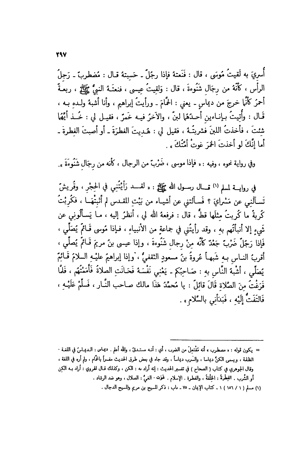 أُسري به لقيتُ موسى، قال: فنعتهُ فإذا رجلٌ - حسبتهُ قال: مُضطربٌ - رَجِلُ الرأس، كأنه من رجال شنوءةَ، قال: ولقيتُ عيسى، فنعته النبي صلى الله عليه وسلم، ربعةً أحمرُ كأنما خرج من ديماسٍ - يعني: الحمام - ورأيت إبراهيم، وأنا أشبهُ ولده به، قال: وأتيتُ بإناءين أحدهما لبنن والآخر فيه خمرٌ، فقيل لي: خُذ أيهما شئت، فأخذتُ اللبن فشربته، فقيل لي: هُديت الفطرة - أو أصبت الفطرة - أما إنك لو أخذت الخمر غوت أمكت".