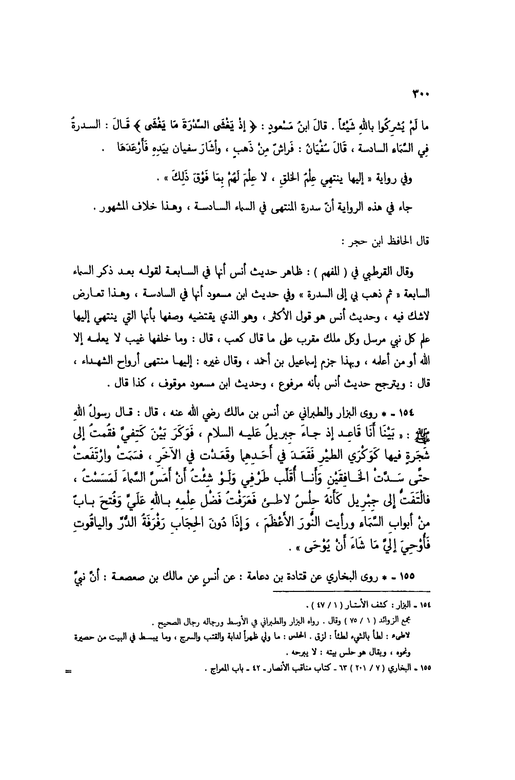 154 - * روى البزار والطبراني عن أنس بن مالك رضي الله عنه، قال: قال رسول الله صلى الله عليه وسلم: "بينا أنا قاعد إذ جاء جبريل عليه السلام، فوكر بين كتفي فقُمتُ إلى شجرة فيه كوكري الطير فقعد في أحدهما وقعدت في الآخر، فسمت وارتفعتْ حتى سدت الخافقين وأنا أقلب طرفي ولو شئت أن أمس السماء لمستُ، فالتفت إلى جبريل كأنه حلسُ لاطئ فعرفت فضل علمه بالله عليَّ وفُتح باب من أبواب السماء ورأيت النور الأعظم، وإذا دون الحجاب رفرفة الدُّر والياقوت فأوحي إلي ما شاء أن يُوحى".