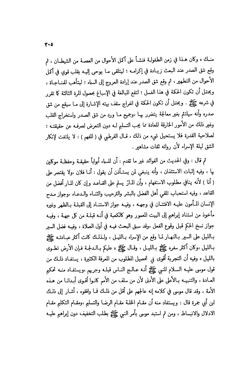 منك" وكان هذا في زمن الطفولة فنشأ على أكمل الأحوال من العصمة من الشيطان، ثم وقع شق الصدر عند البعث زيادة في إكرامه؛ ليتلقى ما يوحى إليه بقلب قوي في أكمل الأحوال من التطهير، ثم وقع شق الصدر عند إرادة العروج إلى السماء؛ ليتأهب للمناجاة، ويحتمل أن تكون الحكمة في هذا الغسل؛ لتقع المبالغة في الإسباغ بحصول المرة الثالثة كما تقرر في شرعه صلى الله عليه وسلم. ويحتمل أن تكون الحكمة في انفراج سقف بيته الإشارة إلى ما سيقع من شق صدره وأنه سيلتئم بغير معالجة يتضرر بها، وجميع ما ورد من شق الصدر واستخراج القلب وغير ذلك من الأمور الخارقة للعادة مما يجب التسليم له دون التعرض لصرفه عن حقيقته، لصلاحية القدرة فلا يستحيل شيء من ذلك، قال القرطبي في (المفهم): لا يلتفت لإنكار الشق ليلة الإسراء لأن رواته ثقات مشاهير.