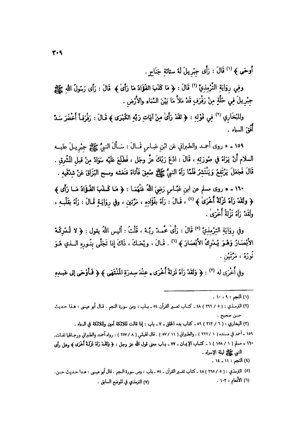 160 - * روى مسلم عن ابن عباس رضي الله عنهما: {مَا كَذَبَ الْفُؤَادُ مَا رَأَى}، {وَلَقَدْ رَآهُ نَزْلَةً أُخْرَى} (4) قال: رآه بفؤاده، مرتين، وفي روايةٍ قال: رآه بقلبه، ولقد رآه نزلة أخرى.