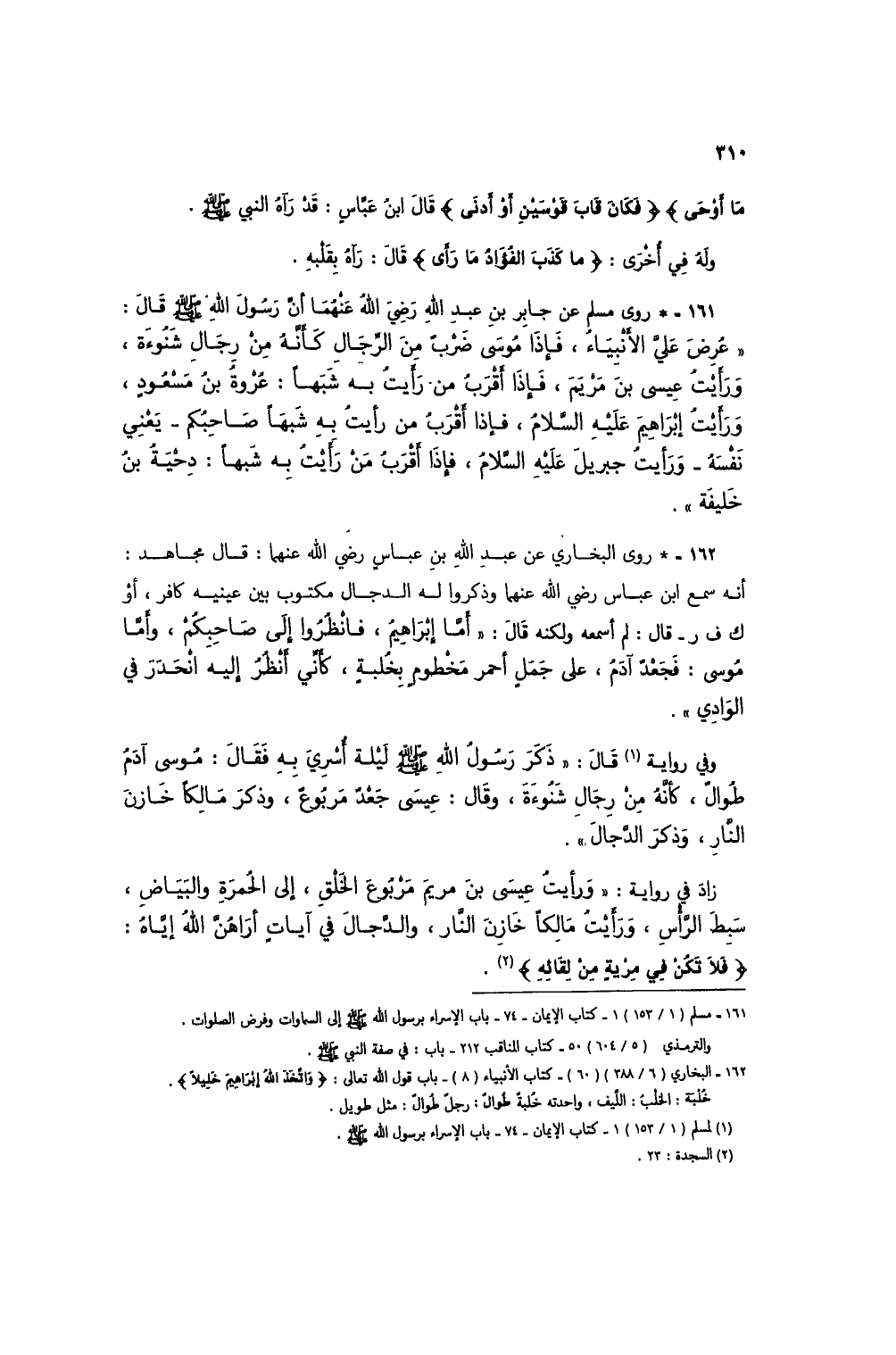 زاد في رواية: "ورأيتُ عيسى بن مريم مربوع الخَلْقِ، إلى الحمرة والبياض، سبط الرأس، ورأيتُ مالكاً خازن النار، والدجال في آياتٍ أراهُن الله إياه: {فَلَا تَكُنْ فِي مِرْيَةٍ مِنْ لِقَائِهِ} (2).