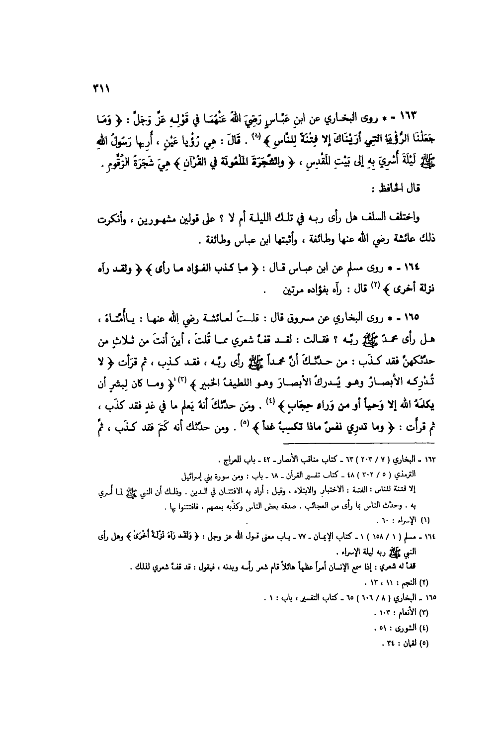 164 - * روى مسلم عن ابن عباس قال: {مَا كَذَبَ الْفُؤَادُ مَا رَأَى} {وَلَقَدْ رَآهُ نَزْلَةً أُخْرَى} (2) قال: رآه بفؤاده مرتين.