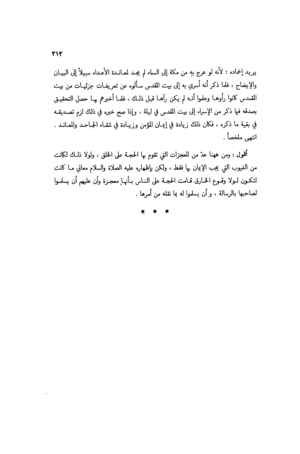 يريد إخماده؛ لأنه لو عرج به من مكة إلى السماء لم يجد لمعاندة الأعداء سبيلاً إلى البيان والإيضاح، فلما ذكر أنه أسري به إلى بيت المقدس سألوه عن تعريفات جزئيات من بيت المقدس كانوا رأوها وعلموا أنه لم يكن رآها قبل ذلك، فلما أخبرهم بها حصل التحقيق بصدقه فيما ذكر من الإسراء إلى بيت المقدس في ليلة، وإذا صح خبره في ذلك لزم تصديقه في بقية ما ذكره، فكان ذلك زيادة في إيمان المؤمن وزيادة في شقاء الجاحد والمعاند. انتهى ملخصاً.