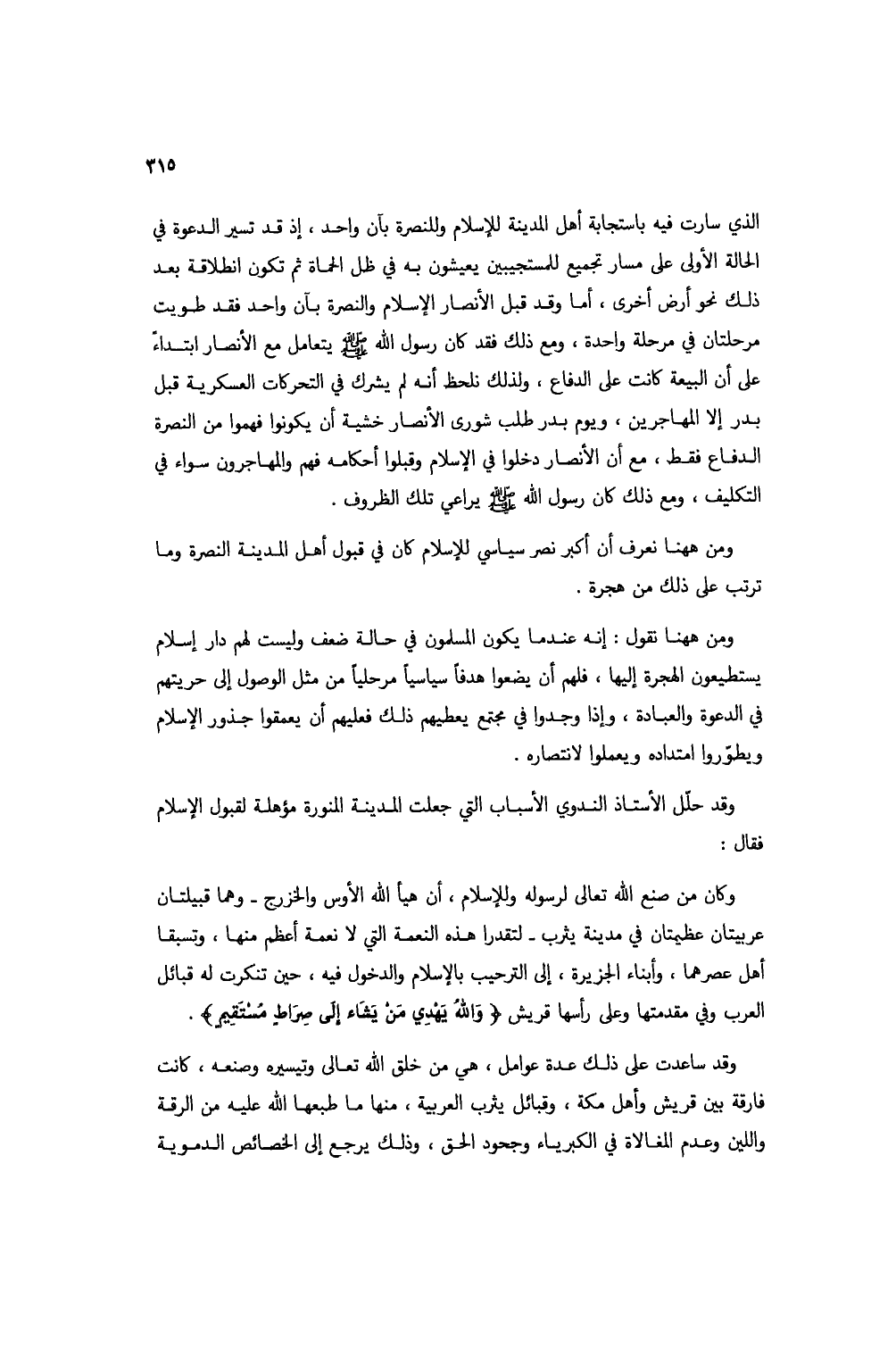 وقد حلل الأستاذ الندوي الأسباب التي جعلت المدينة المنورة مؤهلة لقبول الإسلام فقال: