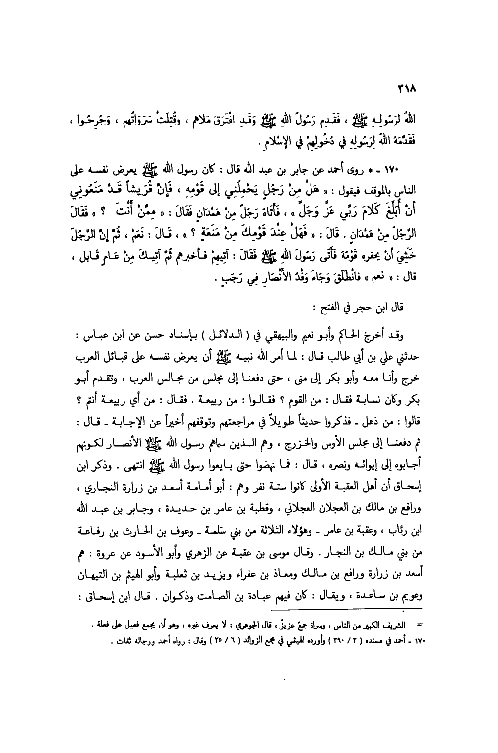 170 - * روى أحمد عن جابر بن عبد الله قال: كان رسول الله صلى الله عليه وسلم يعرض نفسه على الناس بالموقف فيقول: "هل من رجلٍ يحملني إلى قومه، فإن قُريشاً قد منعوني أن أبلغ كلام ربي عز وجل"، فأتاه رجلٌ من همدانٍ فقال: "ممن أنت؟ " فقال الرجل من همدان. قال: "فهل عند قومك من منعةٍ؟ "، قال: نعم، ثم إن الرجل خشي أن يحقره قومه فأتى رسول الله صلى الله عليه وسلم فقال: آتيهم فأخبرهم ثم آتيك من عام قابل، قال: "نعم" فانطلق وجاء وفدُ الأنصار في رجبٍ.