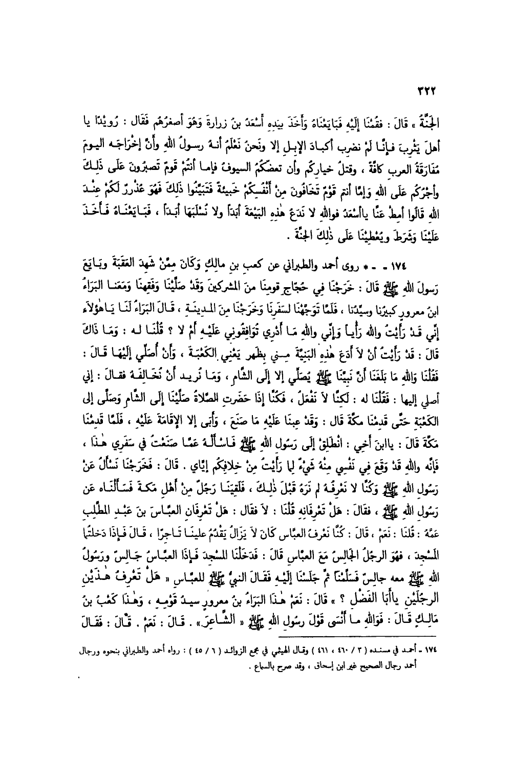 174 - * روى أحمد والطبراني عن كعب بن مالك وكان ممن شهد العقبة وبايع رسول الله صلى الله عليه وسلم قال: خرجنا في حُجاج قومنا من المشركين وقد صلينا وفقهنا ومعنا البراء ابن معرور كبيرنا وسيدنا، فلما توجهنا لسفرنا وخرجنا من المدينة، قال البراء لنا يا هؤلاء إني قد رأيت والله رأياً وإني والله ما أدري توافقوني عليه أم لا؟ قلنا له: وما ذاك قال: قد رأيتُ أن لا أدع هذه البنية مني بظهر يعني الكعبة، وأن أصلي إليها قال: فقلنا والله ما بلغنا أن نبينا صلى الله عليه وسلم يصلي إلا إلى الشام، وما نُريد أن نخالفه فقال: إني أصلي إليها: فقلنا له: لكنا لا نفعل، فكنا إذا حضرت الصلاة صلينا إلى الشام وصلى إلى الكعبة حتى قدمنا مكة قال: وقد عبنا عليه ما صنع، وأبى إلا الإقامة عليه، فلما قدمنا مكة قال: يا ابن أخي: انطلق إلى رسول الله صلى الله عليه وسلم فاسأله عما صنعتُ في سفري هذا، فإنه والله قد وقع في نفسي منه شيء لما رأيتُ من خلافكم إياي. قال: فخرجنا نسألُ عن رسول الله صلى الله عليه وسلم وكنا لا نعرفه لم نره قبل ذلك، فلقينا رجلٌ من أهل مكة فسألناه عن رسول الله صلى الله عليه وسلم، فقال: هل تعرفانه قلنا: لا فقال: هل تعرفان العباس بن عبد المطلب عمه: قلنا: نعم، قال: كنا نعرف العباس كان لا يزال يقدم علينا تاجراً، قال فإذا دخلتما المسجد، فهو الرجل الجالس مع العباس قال: فدخلنا المسجد فإذا العباس جلس ورسول الله صلى الله عليه وسلم معه جالسٌ فسلمان ثم جلسنا إليه فقال النبي صلى الله عليه وسلم للعباس "هل تعرفُ هذين الرجلين يا أبا الفضل؟ " قال: نعم هذا البراء بن معرور سيد قومه، وهذا كعب بن مالك قال: فوالله ما أنسى قول رسول الله صلى الله عليه وسلم "الشاعر". قال: نعم. قال: فقال