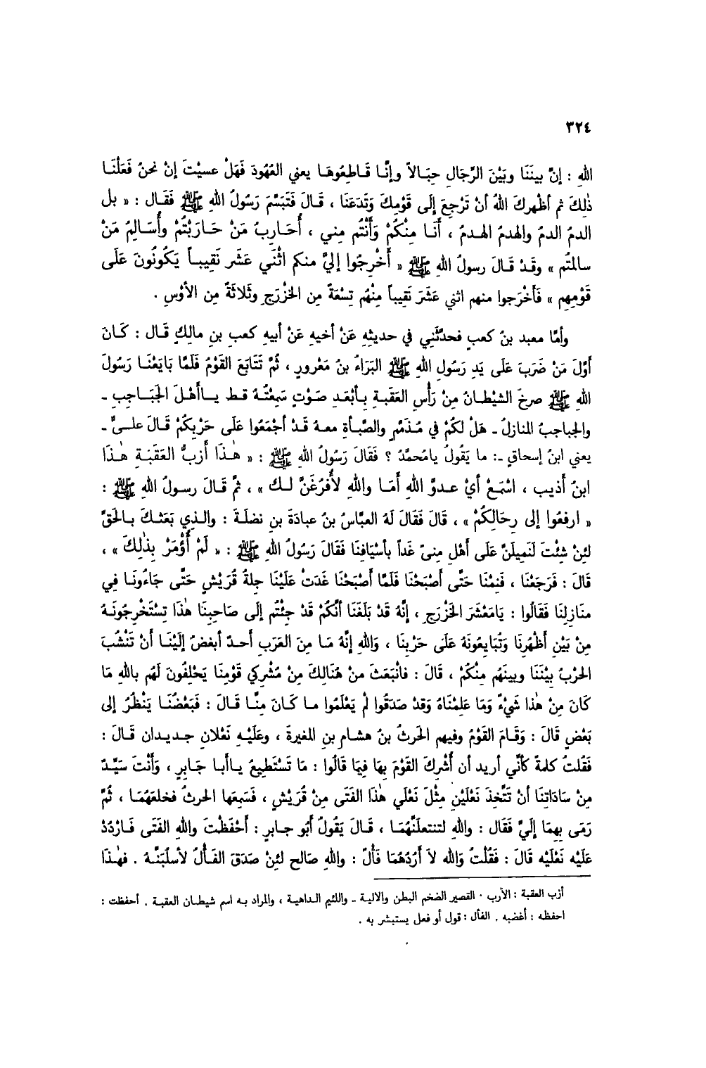 وأما معبد بن كعب فحدثني في حديثه عن أخيه عن أبيه كعب بن مالك قال: كان أول من ضرب على يد رسول الله صلى الله عليه وسلم البراء بن معرور، ثم تتابع القوم فلما بايعنا رسول الله صلى الله عليه وسلم صرخ الشيطان من رأس العقبة بأبعد صوت سمعته قط يا أهل الجباجب - والجباجبُ المنازلُ - هل لكم في مُذَمَّمٍ والصبأة معه قد أجمعوا على حربكم قال علي - يعني ابن إسحاق -: ما يقول يا محمد؟ فقال رسول الله صلى الله عليه وسلم: "هذا أزبُّ العقبة هذا ابن أذيب، اسمع أي عدو الله أما والله لأفرغن لك"، ثم قال رسول الله صلى الله عليه وسلم: "ارفعوا إلى رحالكم"، قال فقال له العباس بن عبادة بن نضلة: والذي بعثك بالحق لئن شئت لنملين على أهل مني غداً بأسيافنا فقال رسول الله صلى الله عليه وسلم: "لم أؤمر بذلك"، قال: فرجعنا، فنمنا حتى أصبحنا فلما أصبحنا غدت علينا جلة قريش حتى جاءونا في منازلنا فقالوا: يا معشر الخزرج، إنه قد بلغنا أنكم قد جئتم إلى صاحبنا هذا تستخرجونه من بين أظهرنا وتبايعونه على حربنا، والله إنه ما من العرب أحدٌ أبغض إلينا أن تنشُبَ الحربُ بيننا وبينهم منكم، قال: فانبعث من هنالك من مشركي قومنا يحلفون لهم بالله ما كان من هذا شيء وما علمناه وقد صدقوا لم يعلموا ما كان منا قال: فبعضنا ينظر إلى بعض قال: وقام القوم وفيهم الحرث بن هشام بن المغيرة، وعليه نعلان جديدان قال: فقلت كلمة كأني أريد أن أشرك القوم بها فيما قالوا: ما تستطيع يا أبا جابر، وأنت سيدٌ من ساداتنا أن تتخذ نعلين مثل نعلي هذا الفتى من قريش، فسمعها الحرث فخلعهما، ثم رمى بهما إليَّ فقال: والله لتنتعلنهُما، قال يقول أبو جابر: أحفظت والله الفتى فارْدد عليه نعليه قال: فقلتُ والله لا أردهما فألٌ: والله صالح لئن صدق الفأل لأسلبنهُ. فهذا