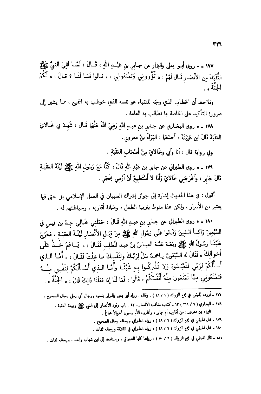 179 - * روى الطبراني عن جابر بن عبد الله قال: كنا مع رسول الله صلى الله عليه وسلم ليلة العقبة قال جابر: وأخرجني خالاي وأنا لا أستطيع أن أرمي بحجرٍ.