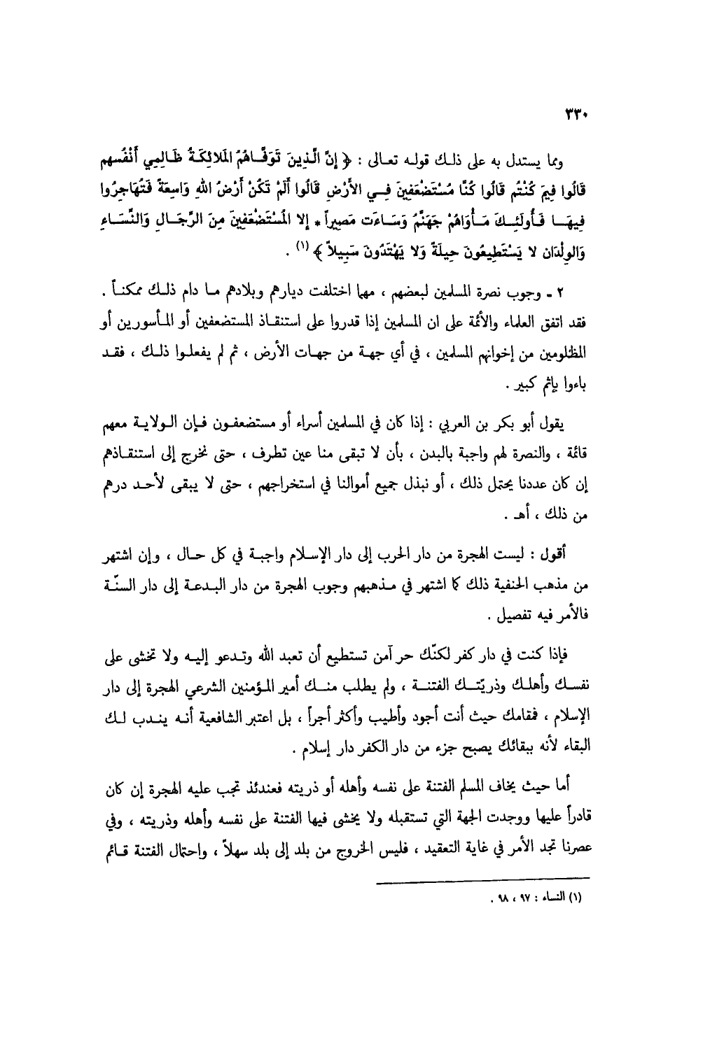 ومما يستدل به على ذلك قوله تعالى: {إِنَّ الَّذِينَ تَوَفَّاهُمُ الْمَلَائِكَةُ ظَالِمِي أَنْفُسِهِمْ قَالُوا فِيمَ كُنْتُمْ قَالُوا كُنَّا مُسْتَضْعَفِينَ فِي الْأَرْضِ قَالُوا أَلَمْ تَكُنْ أَرْضُ اللَّهِ وَاسِعَةً فَتُهَاجِرُوا فِيهَا فَأُولَئِكَ مَأْوَاهُمْ جَهَنَّمُ وَسَاءَتْ مَصِيرًا * إِلَّا الْمُسْتَضْعَفِينَ مِنَ الرِّجَالِ وَالنِّسَاءِ وَالْوِلْدَانِ لَا يَسْتَطِيعُونَ حِيلَةً وَلَا يَهْتَدُونَ سَبِيلًا} (1).