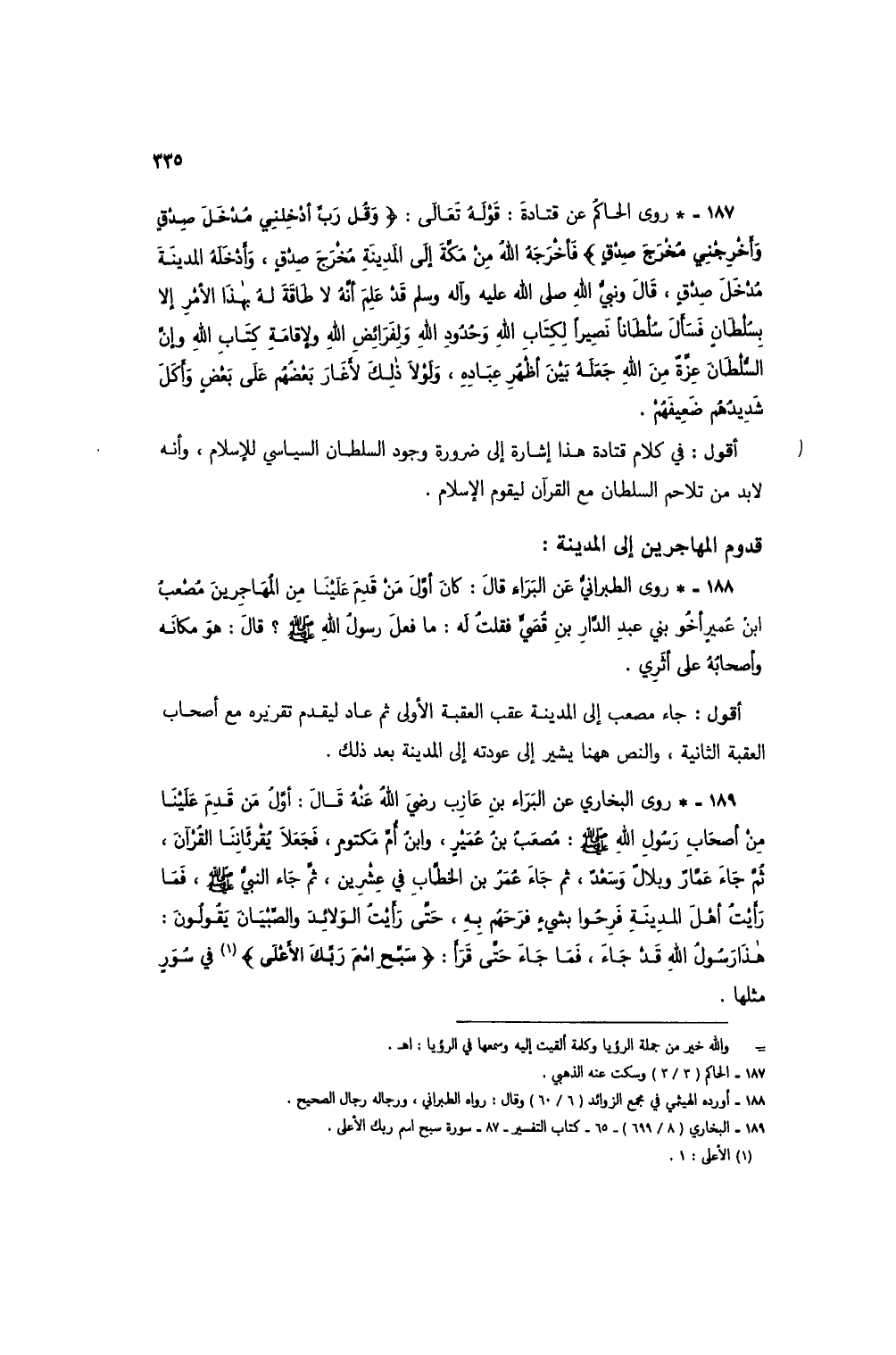 187 - * روى الحاكم عن قتادة: قوله تعالى: {وَقُلْ رَبِّ أَدْخِلْنِي مُدْخَلَ صِدْقٍ وَأَخْرِجْنِي مُخْرَجَ صِدْقٍ} فأخرجه الله من مكة إلى المدينة مُخرج صدقٍ، وأدخله المدينة مُدخل صدقٍ، قال ونبي الله صلى الله عليه وآله وسلم قد علم أنه لا طاقة له بهذا الأمر إلا بسلطان فسأل سلطاناً نصيراً لكتاب الله وحدود الله ولفرائض الله ولإقامة كتاب الله وإن السلطان عزة من الله جعله بين أظهر عباده، ولولا ذلك لأغار بعضهم على بعض وأكل شديدهم ضعيفهم.
