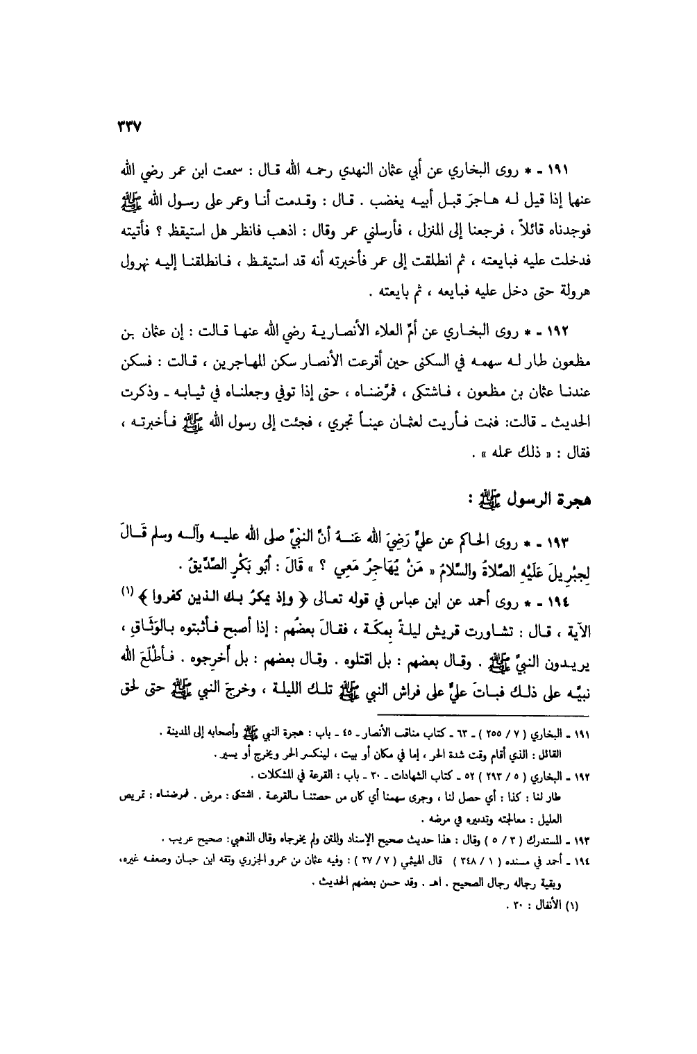 191 - * روى البخاري عن أبي عثمان النهدي رحمه الله قال: سمعت ابن عمر رض يالله عنهما إذا قيل له هاجر قبل أبيه يغضب. قال: وقدمت أنا وعمر على رسول الله صلى الله عليه وسلم فوجدناه قائلاً، فرجعنا إلى المنزل، فأرسلني عمر وقال: اذهب فانظر هل استيقظ؟ فأتيته فدخلت عليه فبايعته، ثم انطلقت إلى عمر فأخبرته أنه قد استيقظ، فانطلقنا إليه نهرول هرولة حتى دخل عليه فبايعه، ثم بايعته.