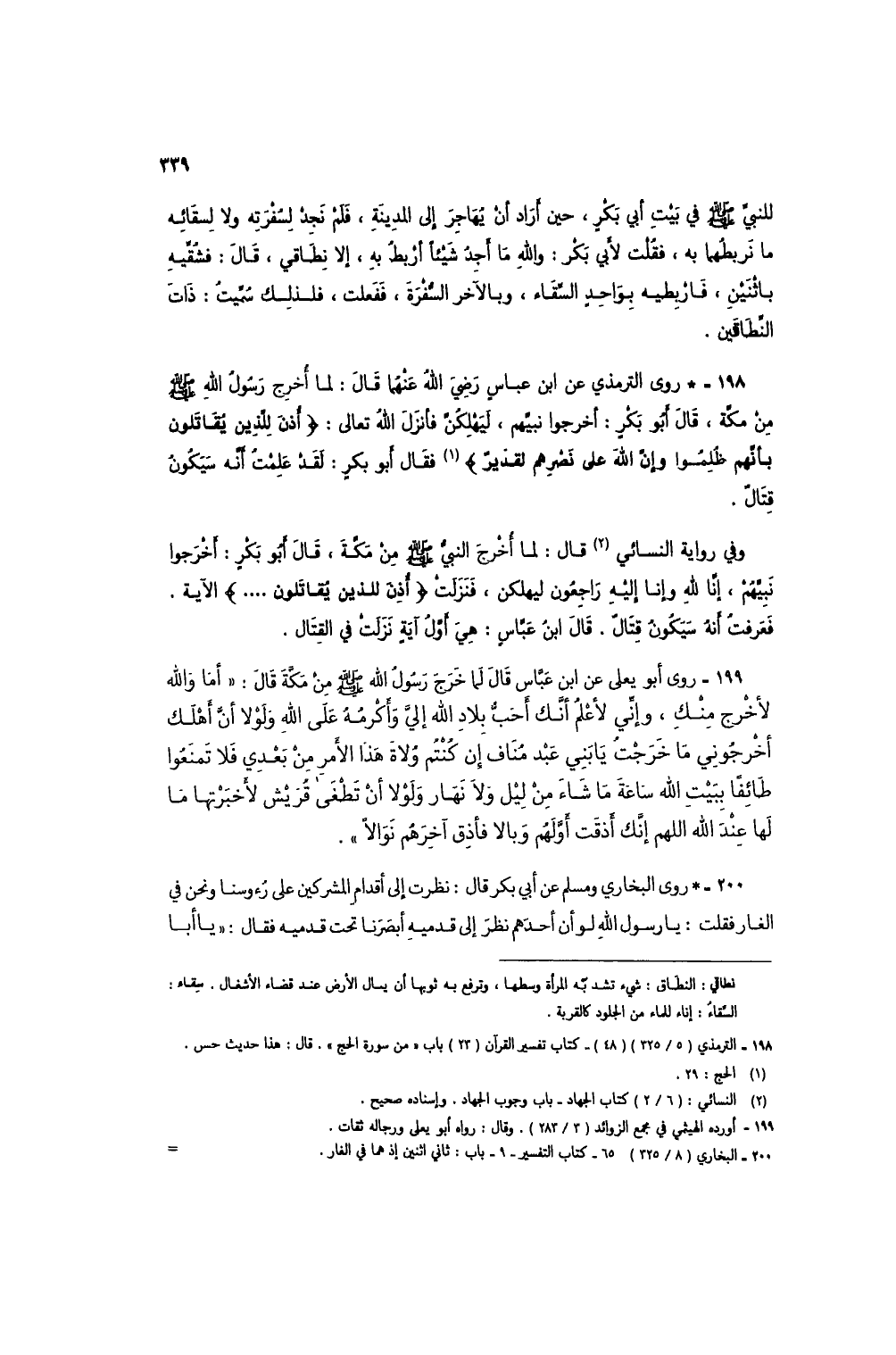 198 - * روى الترمذي عن ابن عباس رضي الله عنهما قال: لما أُخرج رسول الله صلى الله عليه وسلم من مكة، قال أبو بكر: أخرجوا نبيهم، ليهلكن فأنزل الله تعالى: {أُذِنَ لِلَّذِينَ يُقَاتَلُونَ بِأَنَّهُمْ ظُلِمُوا وَإِنَّ اللَّهَ عَلَى نَصْرِهِمْ لَقَدِيرٌ} (1) فقال أبو بكر لقد علمت أنه سيكون قتالٌ.