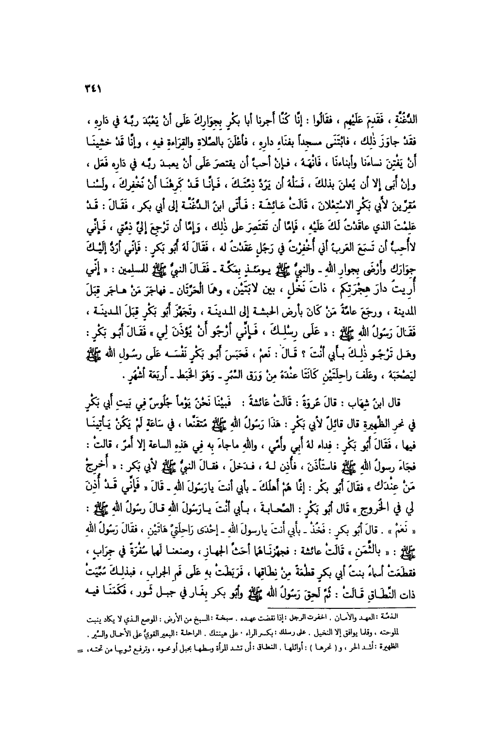 الدُّغنة، فقدِمَ عليهم، فقالوا: إنا كنا أجرنا أبا بكر بجوارك على أن يعبد ربه ف يداره، فقد جاوز ذلك، فابتنى مسجداً بفناء داره، فأعلن بالصلاة والقراءة فيه، وإنا قدخشينا أن يفتن نساءنا وأبناءنا، فانههُ، فإن أحب أن يقتصر على أنْ يعبد ربه في داره فعل، وإن أبى إلا أن يُعلن بذلك، فسلهُ أن يرد ذمتك، فإنا قد كرهنا أن نخفرك، ولسنا مقرين لأبي بكر الاستعلان، قالت عائشة: فأتى ابن الدغنة إلى أبي بكر، فقال: قد علمت الذي عاقدت لك عليه، فإما أن تقتصر على ذلك، وإما أن ترجع إليِّ ذمتي، فإني لا أحب أن تسمع العرب أني أخفرتُ في رجل عقدتُ له، فقال له أبو بكر: فإني أردُّ إلأيك جوارك وأرضي بجوار الله - والنبي صلى الله عليه وسلم يومئذ بمكة - فقال النبي صلى الله عليه وسلم للمسلمين: "إني أريتُ دار هجرتكم، ذات نخلٍ، بين لابتين" وهما الحرتان - فهاجر منْ هاجر قِبَلَ المدينة، ورجع عامةُ من كان بأرض الحبشة إلى المدينة، وتجهر أبو بكر قِبَلَ المدينة، فقال رسول الله صلى الله عليه وسلم: "على رسلك، فإني أرجو أن يؤذن لي" فقال أبو بكر: وهل ترجو ذلك بأبي أنت؟ قال: نعم، فحبس أبو بكر نفسه على رسول الله صلى الله عليه وسلم ليصحبه، وعلف راحلتين كانتا عنده من ورق السمُرِ - وهو الخبط - أربعة أشهرٍ.