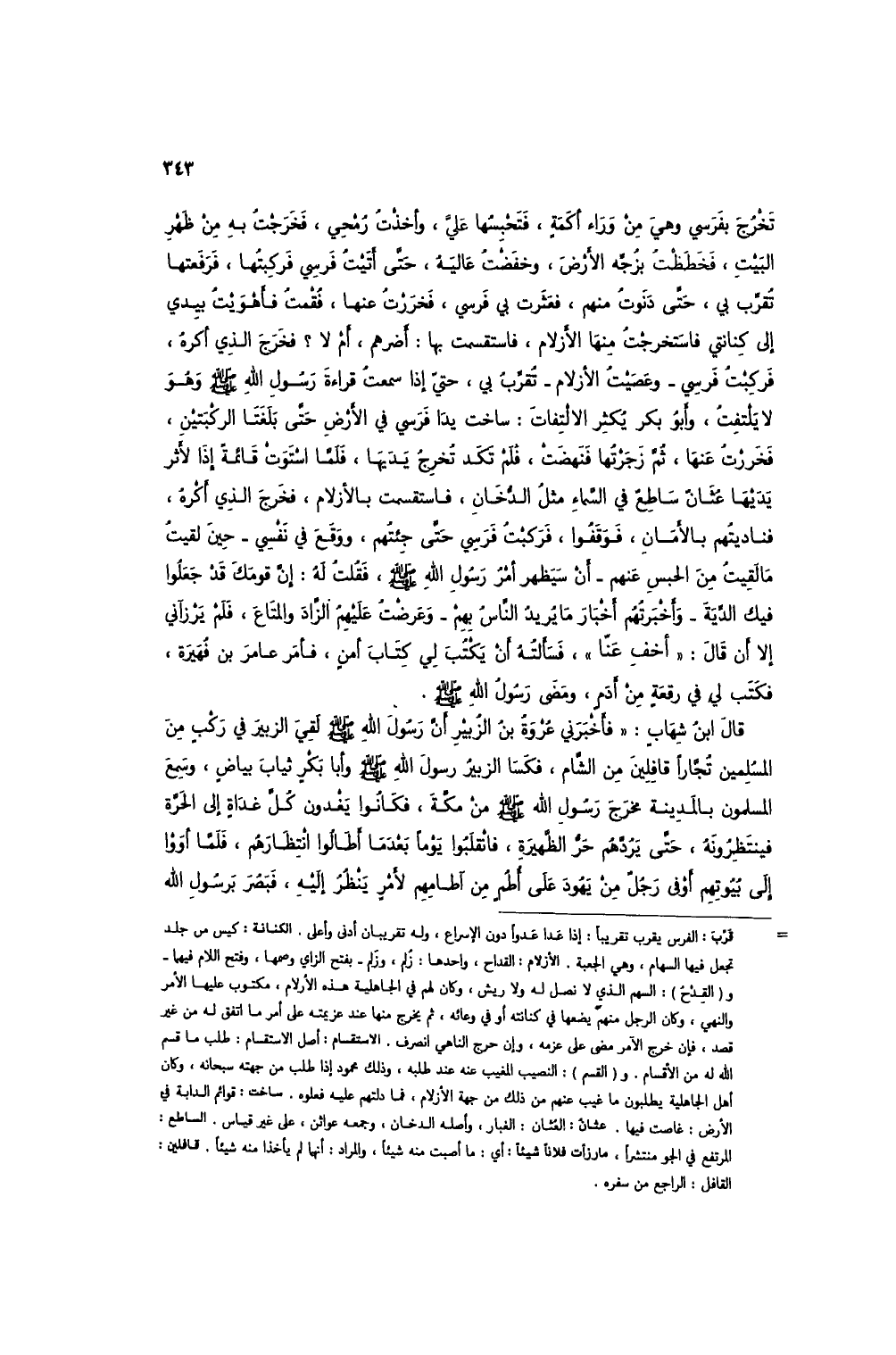 = الرُبَ: الفرس يقرب تقريباً، إذا غدا عدواً دون الإسراع، وله تقريبان أدنى وأعلى. الكنانة: كيس من جلد تجعل فيها السهام، وهي الجعبة. الأزلام: القداح، واحدها: زُلم، وزَلم - بفتح الزاي وصمها، وفتح اللام فيهما - و (القِدْحُ): السهم الذي لا تصل له ولا ريش، وكان لهم في الجاهلية هذه الأزلام، مكتوب عليها الأمر والنهي، وكان الرجل منهم يضعها في كنانته أو في وعائه، ثمي خرج منها عند عزيمته على أمر ما اتفق له من غير قصد، فإن خرج الآمر مضى على عزمه، وإن خرج الناهي انصرف. الاستقسام: أصل الاستقسام: طلب ما قسم الله له من الأقسام. و (القسم): النصيب المغيب عنه عند طلبه، وذلك محمود إذا طلب من جهته سبحانه، وكان أهل الجاهلية يطلبون ما غيب عنهم من ذلك من جهة الأزلام، فما دلتهم عليه فعلوه. ساخت: قوائم الدابة في الأرض: غاصت فيها. عثان: العُثان: الغبار، وأصله الدخان، وجمعه عواثن، على غير قياس. الساطع: المرتفع في الجو منتشراً، ما رزأت فلاناً شيئاً: أي: ما أصبت منه شيئاً، والمراد: أنهما لم يأخذا منه شيئاً. قافلين: القافل: الراجع من سفره.