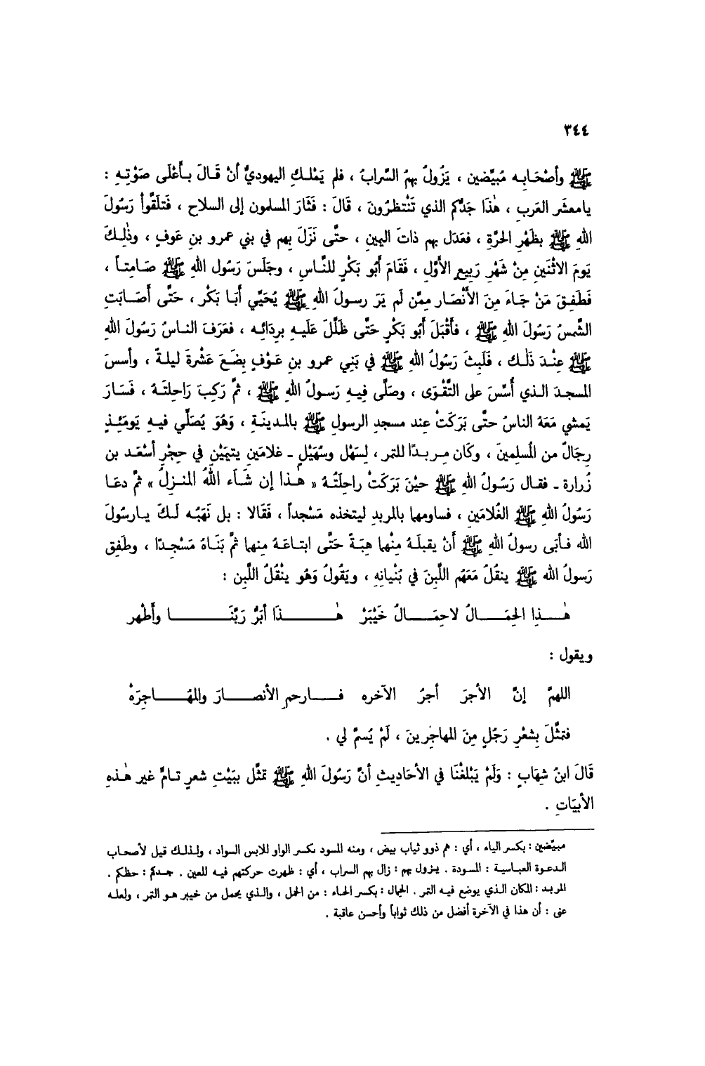 صلى الله عليه وسلم وأصحابه مُبيضين، يزولُ بهم السرابُ، فلم يملك اليهوديُّ أن قال بأعلى صوته: يا معشر العرب، هذا جدكم الذي تنتظرون، قال: فثار المسلمون إلى السلاح، فتلقوا رسول الله صلى الله عليه وسلم بظهر الحرة، فعدل بهم ذات اليمين، حتى نزل بهم في بني عمرو بن عوفٍ، وذلك يوم الإثنين من شهر ربيع الأول، فقام أبو بكر للناس، وجلس رسول الله صلى الله عليه وسلم صامتاً، فطفق من جاء من الأنصار ممن لم ير رسول الله صلى الله عليه وسلم يحيي أبا بكر، حتى أصابت الشمس رسول الله صلى الله عليه وسلم، فأقبل أبو بكر حتى ظلل عليه بردائه، فعرف الناسُ رسول الله صلى الله عليه وسلم عند ذلك، فلبث رسول الله صلى الله عليه وسلم في بني عمرو بن عوفٍ بضع عشرة ليلةً، وأسس المسجد الذي أسس على التقوى، وصلى فيه رسول الله صلى الله عليه وسلم، ركب راحلتهُ، فسار يمشي معه الناس حتى بركت عند مسجد الرسول صلى الله عليه وسلم بالمدينة، وهو يُصلي فيه يومئذٍ رجال من المسلمين، وكان مريداً للتمر، لسهل وسُهيل - غلامين يتيمين ف يحجر أسعد بن زُرارة - فقال رسول الله صلى الله عليه وسلم حين بركت راحلته "هذا إن شاء الله المنزلُ" ثم دعا رسول الله صلى الله عليه وسلم الغلامين، فساومهما بالمربد ليتخذه مسجداً، فقالا: بل نهبه لك يا رسول الله فأبى رسول الله صلى الله عليه وسلم أن يقبلهُ منهما هبة حتى ابتاعه منهما ثم بناه مسجداً، وطفق رسول الله صلى الله عليه وسلم ينقل معهم اللَّبِنَ في بُنيانه، ويوقل وهو ينقل اللبن: