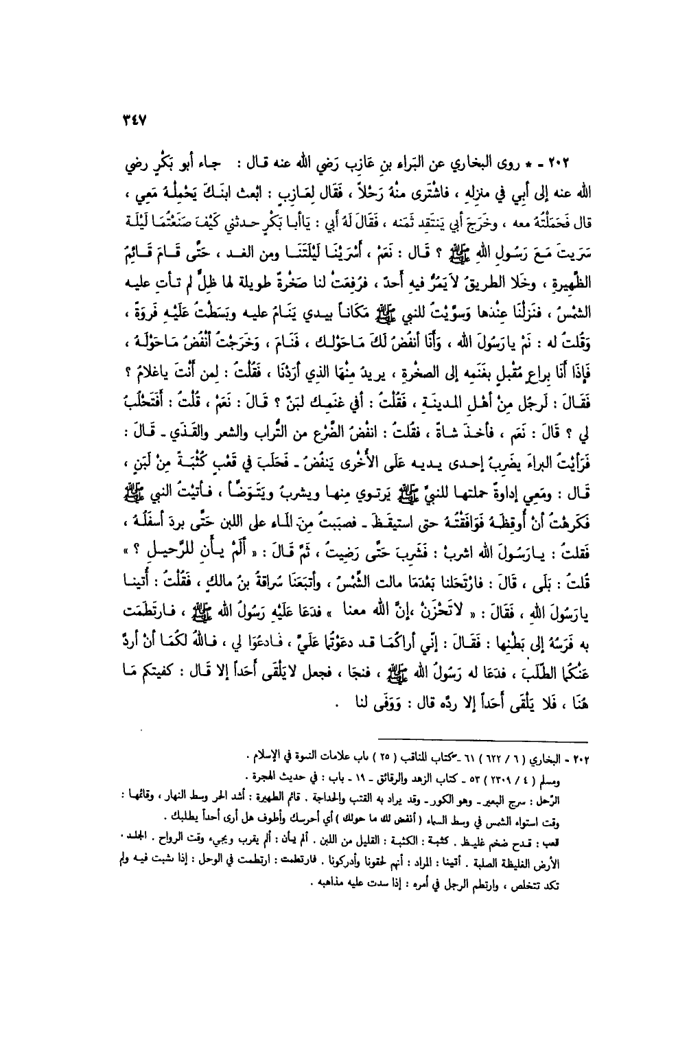 202 - * روى البخاري عن البراء بن عازب رضي الله عنه قال: جاء أبو بكر رضي الله عنه إلى أبي في منزله، فاشترى منه رحْلاً، فقال لعازبٍ: ابعث ابنك يحمله معي، قال فحملته معي، وخرج أبي ينتقد ثمنه، فقال له أبي: يا أبا بكرٍ حدثني كيف صنعتما ليلة سريت مع رسول الله صلى الله عليه وسلم؟ قال: نعم، أسرينا ليلتنا ومن الغد، حتى قام قائمٌ الظهيرة، وخلا الطريق لا يمر فيه أحد، فرفعت لنا صخرة طويلة لها ظل لم تأت عليه الشمس، فنزلنا عندها وسويت للنبي صلى الله عليه وسلم مكاناً بيدي ينامُ عليه وبسطتُ عليه فروةٌ، وقلت له: نم يا رسول الله، وأنا أنفض لك ما حولك، فنم، وخرجت أنفضُ ما حوله، فإذا أنا براعٍ مقبلٍ بغنمه إلى الصخرة، يريدُ منها الذي أردنا، فقلتُ: لمن أنت يا غلام؟ فقال: لرجل من أهل المدينة، فقلت: أفي غنمك لبن؟ قال: نعم، قلتُ: أفتحلبُ لي؟ قال: نعم، فأخذ شاة، فقلتُ: انفض الضرع من التراب والشعر والقذي - قال: فرأيت البراء يضربُ إحدى يديه على الأخرى ينفضُ - فحلب في قعبٍ كثبة من لبنٍ، قال: ومعي إداوةً حملتها للنبي صلى الله عليه وسلم يرتوي منها ويشربُ ويتوضأ، فأتيت النبي صلى الله عليه وسلم فكرهتُ أن أوقظه فوافقته حتى استيقظ - فصببت من الماء على اللبن حتى برد أسفلهُ، فقلت: يا رسول الله اشرب: فشربَ حتى رضيتُ، ثم قال: "ألم يأن للرحيل؟ " قلت: بلى، قال: فارتحلنا بعدها مالت الشمسُ، وأتبعنا سُراقة بن مالك، فقلت: أُتينا يا رسول الله، فقال: "لا تحزن، إن الله معنا" فدعا عليه رسول الله صلى الله عليه وسلم، فارتطمت به فرسه إلى بطنها: فقال: إني أراكما قد دعوتما عليِّ، فادعوا لي، فالله لكما أنْ أرد عنكما الطلب، فدعا له رسول الله صلى الله عليه وسلم، فنجا، فجعل لا يلقى أحداً إلا قال: كفيتكم ما هنا، فلا يلقى أحداً إلا رده قال: ووفى لنا