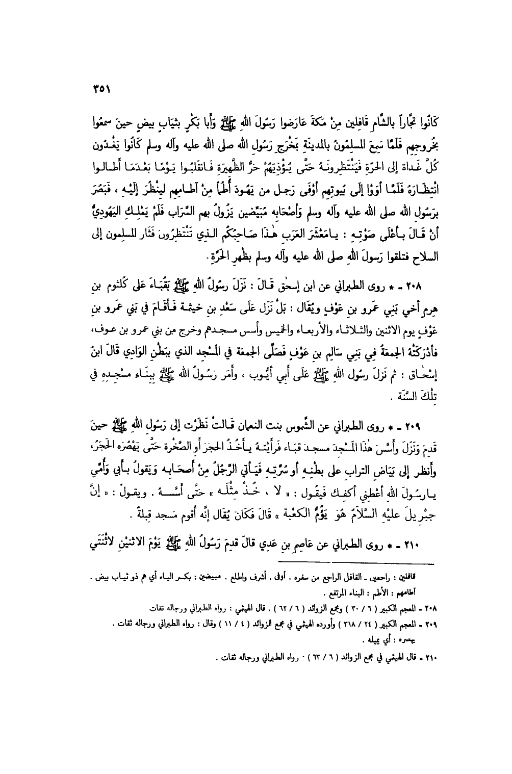 208 - * روى الطبراني عن ابن إسحق قال: نزل رسول الله صلى الله عليه وسلم بقباء على كلثوم بن هِرمِ أخي بني عمرو بن عوفٍ يقال: بل نزل على سعد بن خيثمة فأقام في بني عمرو بن عغوفٍ يوم الاثنين والثلاثاء والأربعاء والخميس وأسس مسجدهم وخرج من بني عمرو بن عوف، فأدركته الجمعة في بني سالم بن عوف فصلى الجمعة في المسجد الذي يبطن الوادي قال ابن إسحاق: ثم نزل رسول الله صلى الله عليه وسلم على أبي أيوب، وأمر رسول الله صلى الله عليه وسلم ببناء مسجده في تلك السَنة.