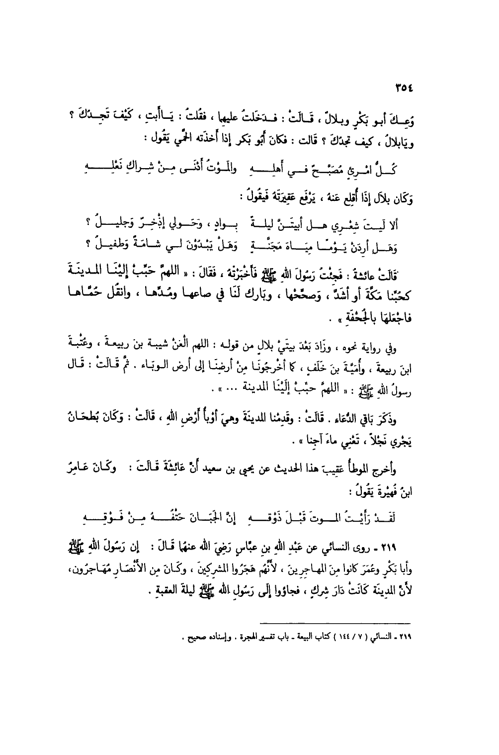 219 - * روى النسائي عن عبد الله بن عباس رضي الله عنهما قال: إن رسول الله صلى الله عليه وسلم وأبا بكر وعمر كانوا من المهاجرين، لأنهم هجروا المشركين، وكان من الأنصار مهاجرون، لأن المدينة كانت دار شركٍ، فجاؤوا إلى رسول الله صلى الله عليه وسلم ليلة العقبةِ