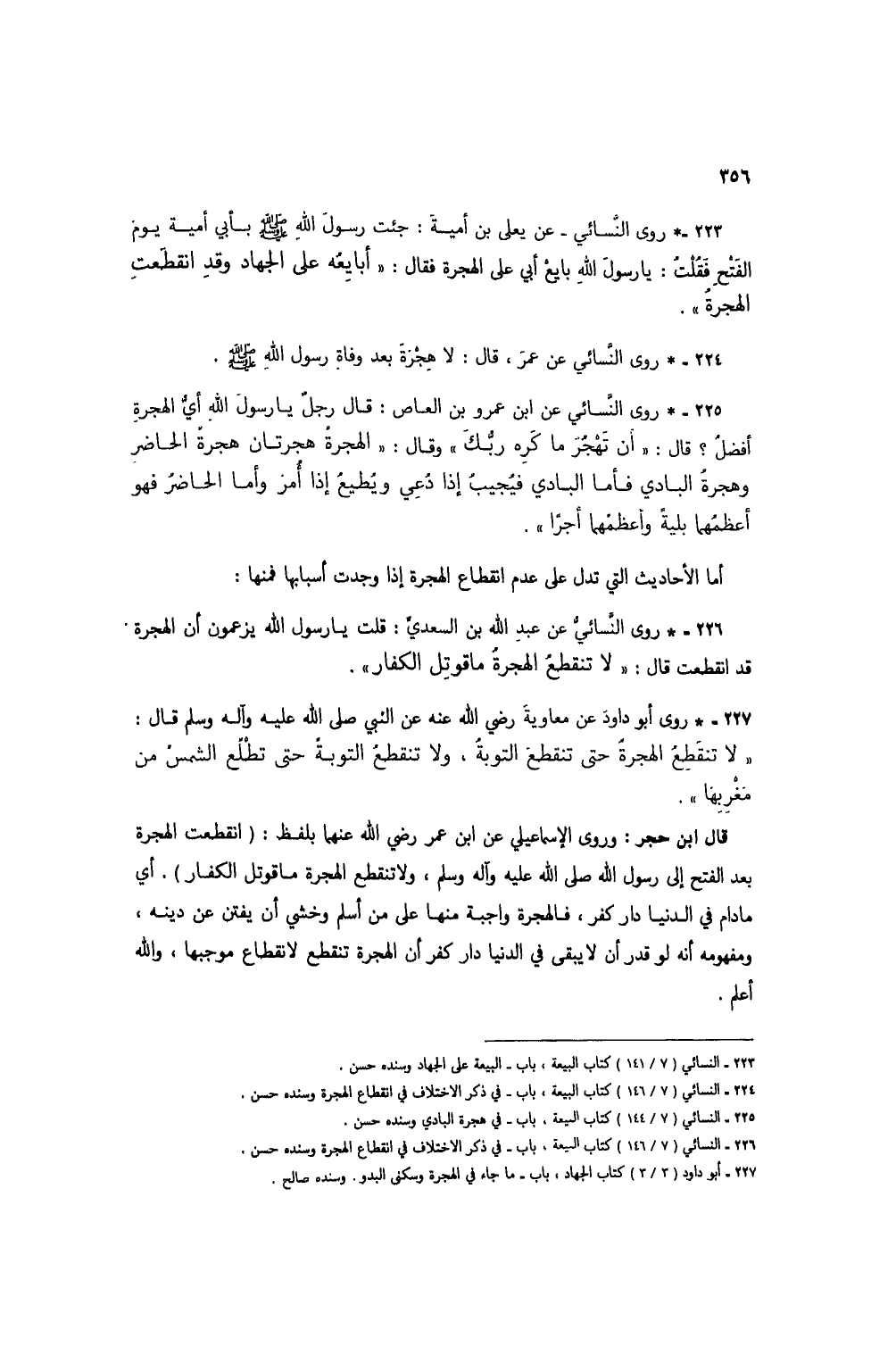 226 - * روى النسائي عن عبد الله بن السعدي: قلت يا رسول الله يزعمون أن الهجرة قد انقطعت قال: "لا تنقطعُ الهجرة ما قوتل الكفار".