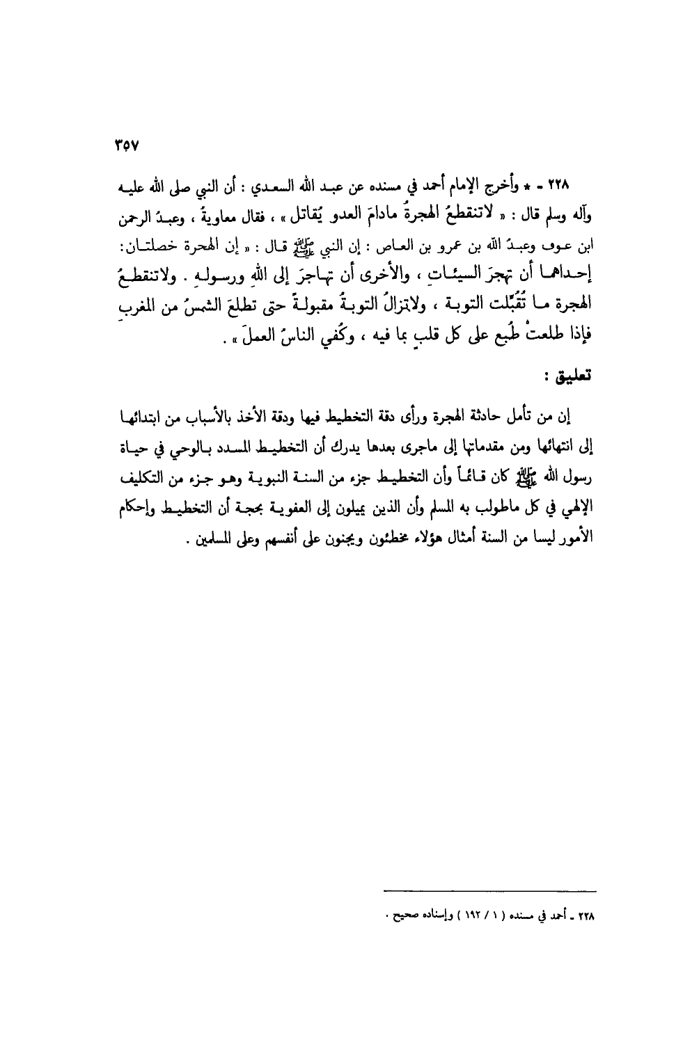 228 - * وأخرج الإمام أحمد في مسنده عن عبد الله السعدي: أن النبي صلى الله عليه وآله وسلم قال: "لا تنقطعُ الهجرة ما دام العدو يُقاتل"، فقال معاوية، وعبد الرحمن ابن عوف وعبد الله بن عمرو بن العاص: إن النبي صلى الله عليه وسلم قال: "إن الهجرة خصلتان: إحداهما أن تهجر السيئات، والأخرى أن تهاجر إلى الله ورسوله. ولا تنقطعُ الهجرة ما تُقُبِّلت التوبة، ولا تزالُ التوبةُ مقبولةً حتى تطلع الشمس من المغرب فإذا طلعتْ طُبع على كل قلبٍ بما فيه، وكُفي الناسُ العمل".