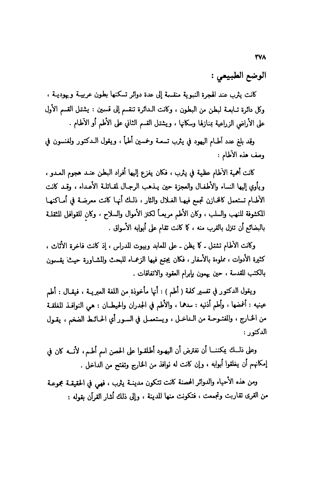 ويقول الدكتور في تفسير كلمة (أطم): أنها مأخوذة من اللغة العبرية، فيقال: أطم عينيه: أغمضها، وأطم أذنيه: سدهما، والأطم في الجدران والحيطان: هي النوافذ المغلقة من الخارج، والمفتوحة من الداخل، ويستعمل في السور أي الحائط الضخم، يقول الدكتور: