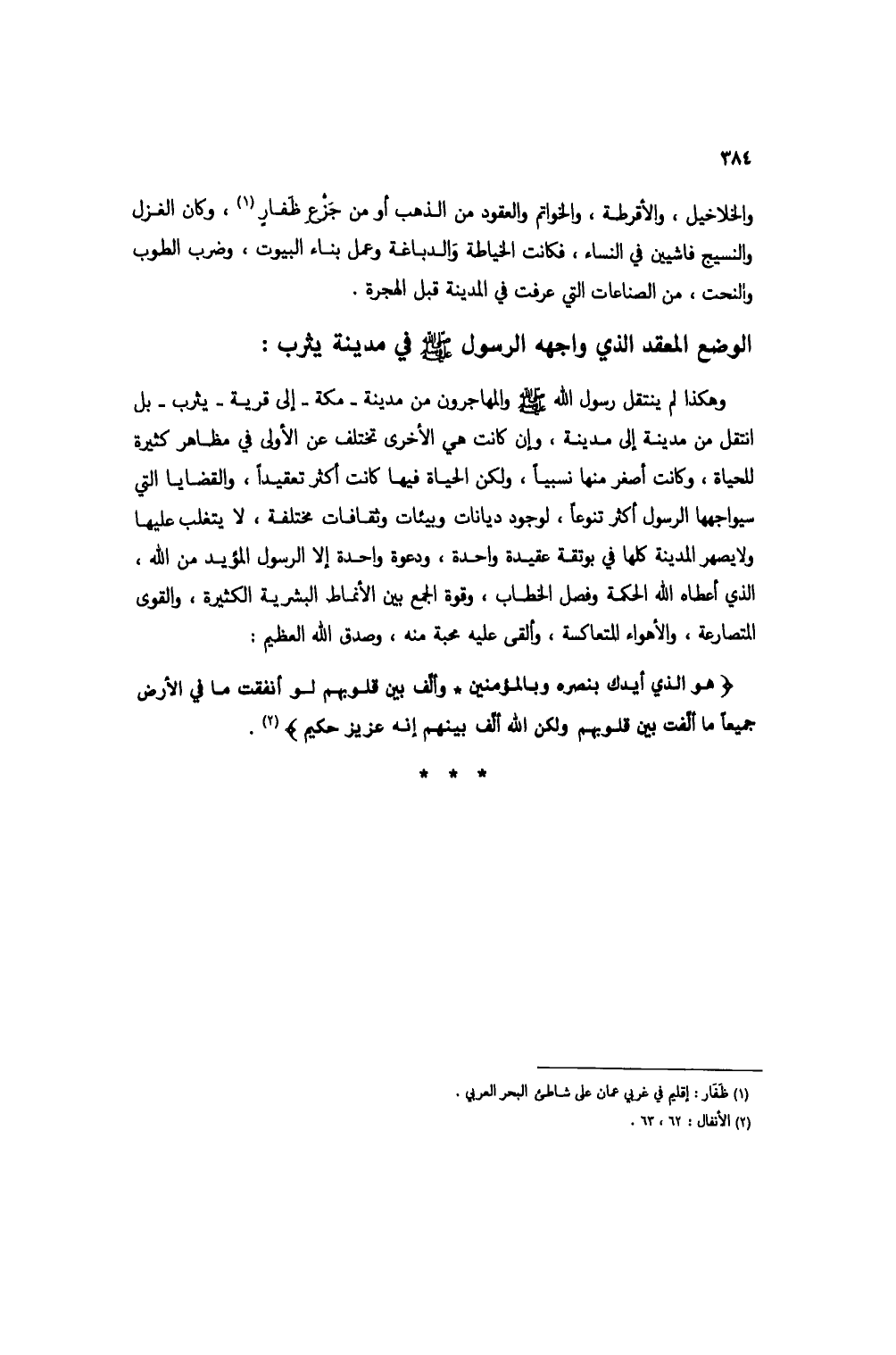 وهكذا لم ينتقل رسول الله صلى الله عليه وسلم والمهاجرون من مدينة - منكة - إلى قرية - يثرب - بل انتقل من مدينة إلى مدينة، وإن كانت هي الأخرى تختلف عن الأولى في مظاهر كثيرة للحياة، وكانت أصغر منها نسبياً، ولكن الحياة فيها كانت أكثر تعقيداً، والقضايا التي سيواجهها الرسول أكثر تنوعاً، لوجود ديانات وبيئات وثقافات مختلفة، لا يتغلب عليها ولا يصهر المدينة كلها في بوتقة عقيدة واحدة، ودعوة واحدة إلا الرسول المؤيد من الله، الذي أعطاه الله الحكمة وفصل الخطاب، وقوة الجمع بين الأنماط البشرية الكثيرة، والقوى المتصارعة، والأهواء المتعاكسة، وألقى عليه محبة منه، وصدق الله العظيم: