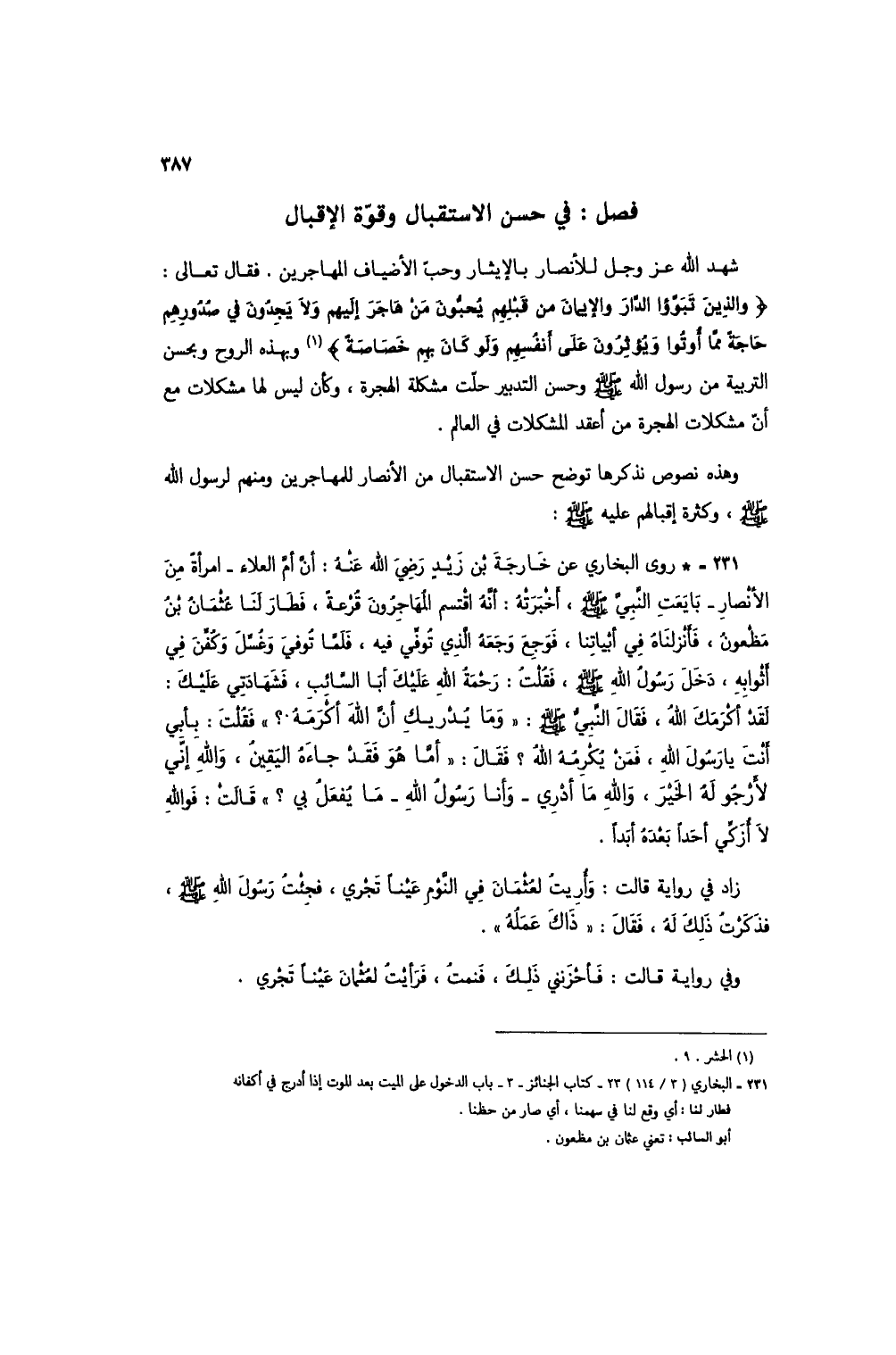 231 - * روى البخاري عن خارجة بن زيد رضي الله عنه: أن أم العلاء - امرأة من الأنصار - بايعت النبي صلى الله عليه وسلم، أخبرته: أنه اقتسم المهاجرون قرعة، فطار لنا عثمان بن مظعون، فأنزلناه في أبياتنا، فوجع وجعهُ الذي توفي فيه، فلما توفي وغُسل وكُفن في أثوابه، دخل رسول الله صلى الله عليه وسلم، فقلت: رحمة الله عليك أبا السائب، فشهادتي عليك: لقد أكرمك الله، فقال النبي صلى الله عليه وسلم: "وما يدريك أن الله أكرمُ؟ " فقلت: بأبي أنت يا رسول الله، فمن يكرمه الله؟ فقال: "أما هو فقد جاءه اليقين، والله إني لأرجو له الخير، والله ما أدري - وأنا رسول الله - ما يُفعلُ بي؟ " قالت: فوالله لا أزكي أحداً بعده أبداً.