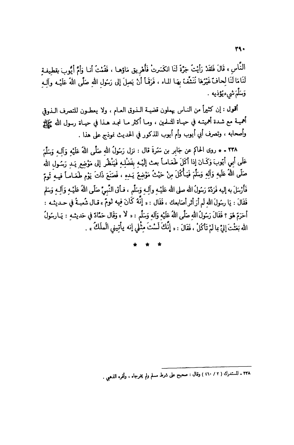 238 - * روى الحاكم عن جابر بن سمرة قال: نزل رسول الله صلى الله عليه وآله وسلم على أبي أيوب وكان إذا أكل طعاماً بعث إليه بفضله فينظُر إلى موضع يد رسول الله صلى الله عليه وآله وسلم فيأكل من حيث موضع يده، فصنع ذات يوم مطعاماً فيه ثوم فأرسل به إليه فردهُ رسولُ الله صلى الله عليه وآله وسلم، فأتى النبي صلى الله عليه وآله وسلم فقال: يا رسول الله لم أر أثر أًابعك، فقال: "إنه كان فيه ثومٌ" قال شعبةُ في حديثه: أحرم هو؟ فقال رسول الله صلى الله عليه وآله وسلم: "لا" وقال حمادٌ في حديثه: يا رسول الله بعثت إلي بما لم تأكل، فقال: "إنك لست مثلي إنه يأتيني الملكُ".