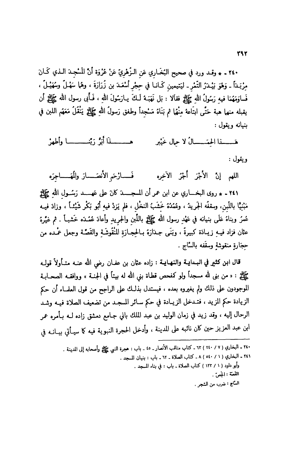 241 - * روى البخار يعن ابن عمر أن المسجد كان على عهد رسول الله صلى الله عليه وسلم مبنياً باللبن، وسقفُه الجريد، وعمُدُه خَشَبُ النخلِ، فلم يزد فيه أبو بكر شيئاً، وزاد فيه عمر وبناء على بنيانه في عهدِ رسول الله صلى الله عليه وسلم باللبن والجريد وأعاد عُمُدُه خشباً. ثم غيرهُ عثمان فزاد فيه زيادة كبيرة، وبني جدارهُ بالحجارة المنقوشة والقصة وجعل عمده من حجارةٍ منقوشةٍ وسقفه بالساج.
