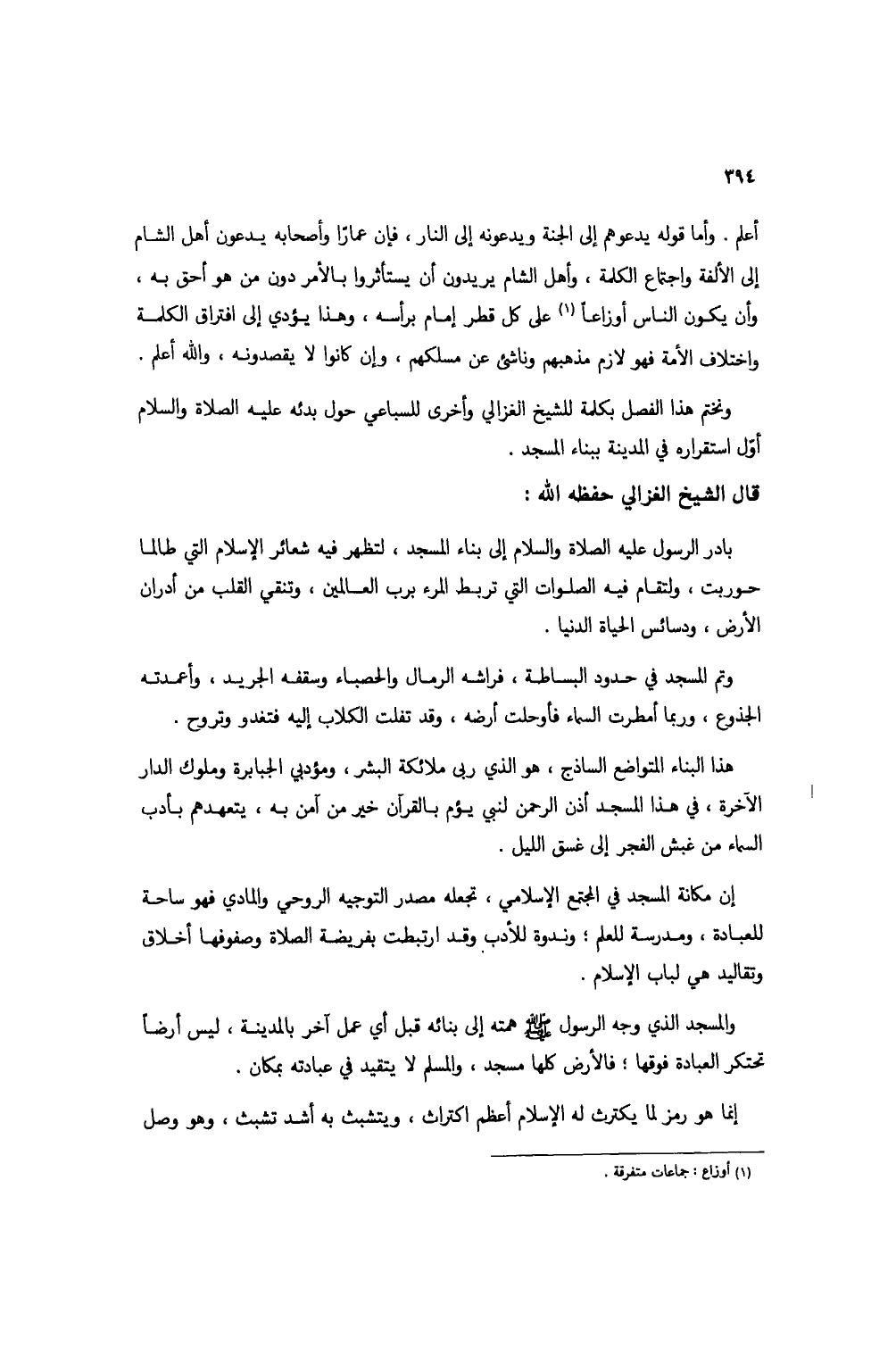 ونختم هذا الفصل بكلمة للشيخ الغزالي وأخرى للسباعي حول بدئه عليه الصلاة والسلام أول استقراره في المدينة ببناء المسجد.