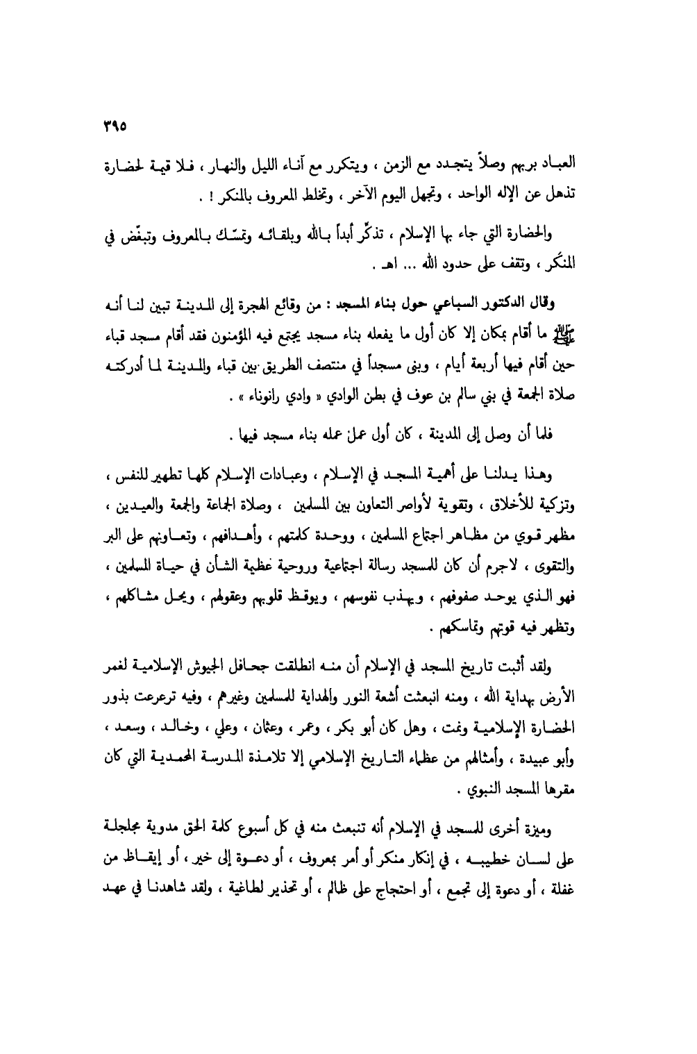 وهذا يدلنا على أهمية المسجد في الإسلام، وعبادات الإسلام كله تطهير للنفس، وتزكية للأخلاق، وتقوية لأواصر التعاون بين المسلمين، وصلاة الجماعة والجمعة والعيدين، مظهر قوي من مظاهر اجتماع المسلمين، ووحدة كلمتهم، وأهدافهم، وتعاونهم على البر والتقوى، لا جرم أن كان للمسجد رسالة اجتماعية وروحية عظيمة الشأن في حياة المسلمين، فهو الذي يوحد صفوفهم، ويهذب نفوسهم، ويوقظ قلوبهم وعقولهم، ويحل مشاكلهم، وتظهر فيه قوتهم وتماسكهم.