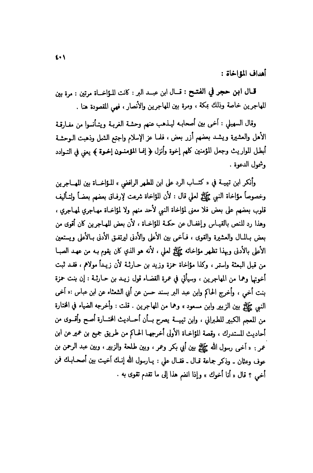 وأنكر ابن تيمية في "كتاب الرد على ابن المطهر الرافضي" المؤاخاة بين المهاجرين وخصوصاً مؤاخاة النبي صلى الله عليه وسلم لعلي قال: لأن المؤاخاة شرعت لإرفاق بعضهم بعضاً ولتأليف قلوب بعضهم على بعض فلا معنى لمؤاخاة النبي لأحد منهم ولا لمؤاخاة مهاجري لمهاجري، وهذا رد للنص بالقياس وإغفال عن حكمة المؤاخاة، لأن بعض المهاجرين كان أقوى من بعض بالمال والعشيرة والقوى، فآخى بين الأعلى والأدنى ليرتفق الأدنى بالأعلى ويستعين الأعلى بالأدنى وبهذا تظهر مؤاخاته صلى الله عليه وسلم لعلي، لأنه هو الذي كان يقوم به من عهد الصبا من قبل البعثة واستمر، وكذا مؤاخاة حمزة وزيد بن حارثة لأن زيداً مولاهم، فقد ثبت أختها وهما من المهاجرين، وسيأتي في عمرة القضاء قول زيد بن حارثة: إن بنت حمزة بنت أخي، وأخرج الحاكم وابن عبد البر بسند حسن عن أبي الشعثاء عن ابن عباس: "آخى النبي صلى الله عليه وسلم بين الزبير وابن مسعود" وهما من المهاجرين. قلت: وأخرجه الضياء في المختارة من المعجم الكبير للطبراني، وابن تيمية يصرح بأن أحاديث المختارة أصح وأقوى من أحاديث المستدرك، وقصة المؤاخاة الأولى أخرجها الحاكم من طريق جميع بن عمير عن ابن عمر: "آخى رسول الله صلى الله عليه وسلم بين أبي بكر وعمر، وبين طلحة والزبير، وبين عبد الرحمن بن عوف وعثمان - وذكر جماعة قال - فقال علي: يا رسول الله إنك آخيت بين أصحابك فمن أخى؟ قال "أنا أخوك" وإذا انضم هذا إلى ما تقدم تقوى به.