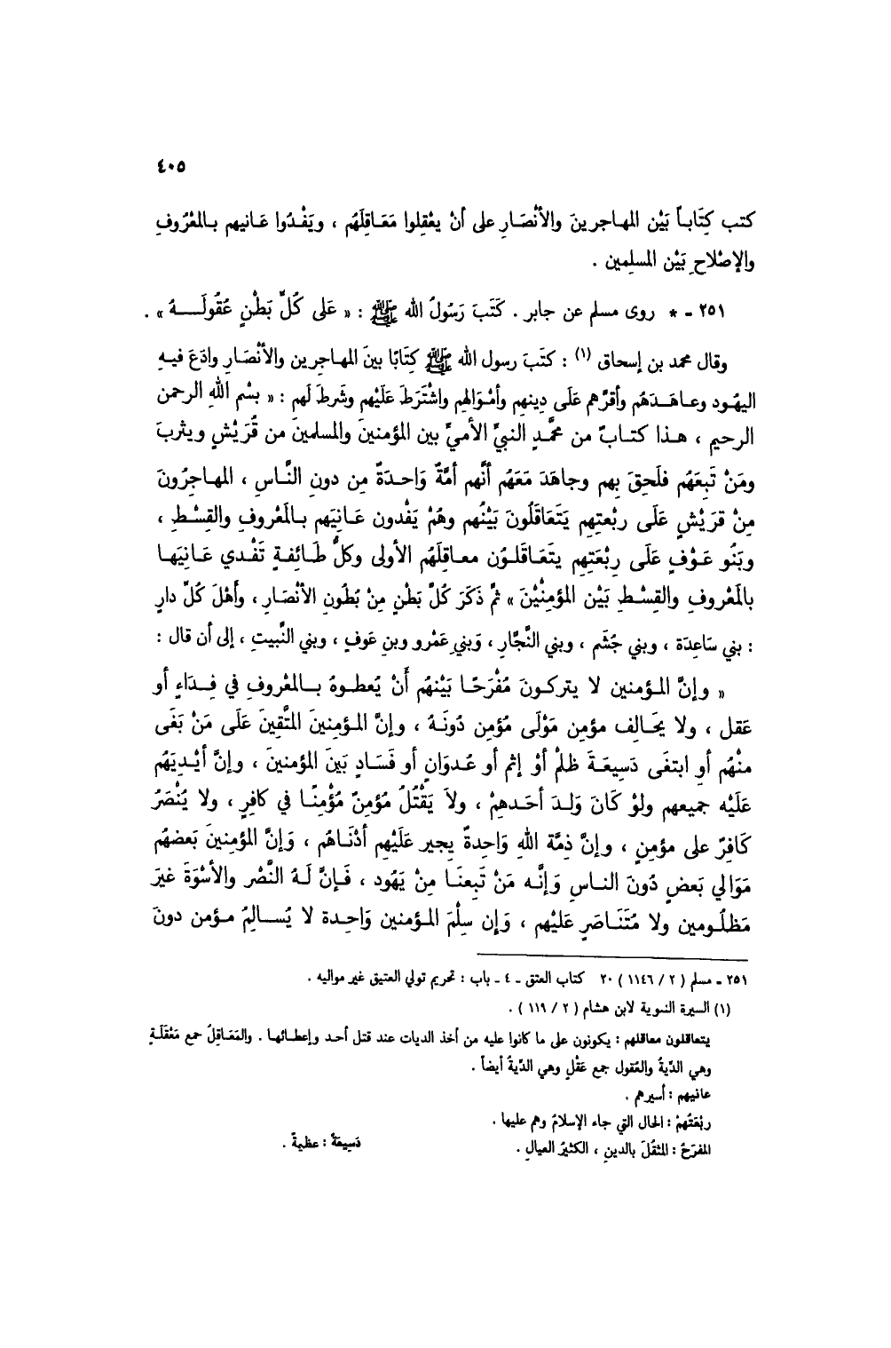 وقال محمد بن إسحاق (1): كتب رسول الله صلى الله عليه وسلم كتاباً بين المهاجرين والأنصار وادع فيه اليهود وعاهدهم وأقرهم على دينهم وأموالهم واشترط عليهم وشرط لهم: "بسم الله الرحمن الرحيم، هذا كتاب من محمد النبي الأمي بين المؤمنين والمسلمين من قريش ويثرب ومن تبعهم فلحق بهم وجاهد معهم أنهم أمةٌ واحدةٌ من دون الناس، المهاجرون من قريش على ربعتهم يتعاقلون بينهم وهم يفدون عانيهم بالمعروف والقسط، وبنو عوفٍ على ربعتهم يتعاقلون معاقلهم الأولى وكل طائفةٍ تفدي عانيها بالمعروف والقسط بين المؤمنين" ثم ذكر كل بطنٍ من بطونِ الأنصار، وأهل كل دارٍ: بني ساعدة، وبني جُشم، وبني النجار، وبني عمرو وبن عوفٍ، وبني النبيت، إلى أن قال: "وإن المؤمنين لا يتركون مُفرحاً بينهُم أنْ يُعطوهُ بالمعروف في فداءٍ أو عقل، ولا يحالف مؤمن مولى مؤمن دونهُ، وإن المؤمنين المتقين على منْ بَفَى منهُم أو ابتغى دسيعة ظلم أو إثم أو عُدوانٍ أو فساد بين المؤمنين، وإن أيديهم عليه جميعهم ولو كان ولد أحدهم، ولا يقتُلُ مؤمن مؤمناً في كافرٍ، ولا يُنْصَرُ كافرٌعلى مؤمنٍ، وإن ذمة الله واحدةٌ يجير عليهم أدناهم، وإن المؤمنين بعضهم موالي بعض دون الناس وإنه من تبعنا من يهُود، فإن له النصر والأسوة غير مظلومين ولا مُتناصرٍ عليهم، وإن سلم المؤمنين واحدة لا يُسالم مؤمن دون