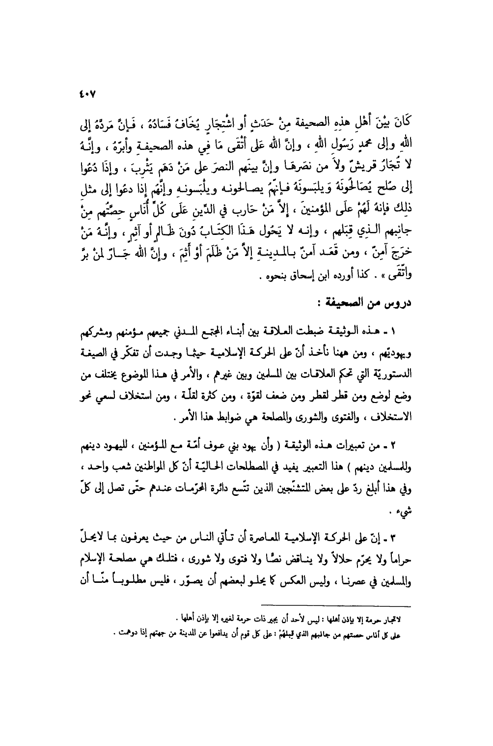 2 - من تعبيرات هذه الوثيقة (وأن يهود بني عوف أمة مع المؤمنين، لليهود دينهم وللمسلمين دينهم) هذا التعبير يفيد في المصطلحات الحالية أن كل المواطنين شعب واحد، وف هذا أبلغ رد على بعض المتشنجين الذين تتسع دائرة المحرمات عندهم حتى تصل إلى كل شيء.