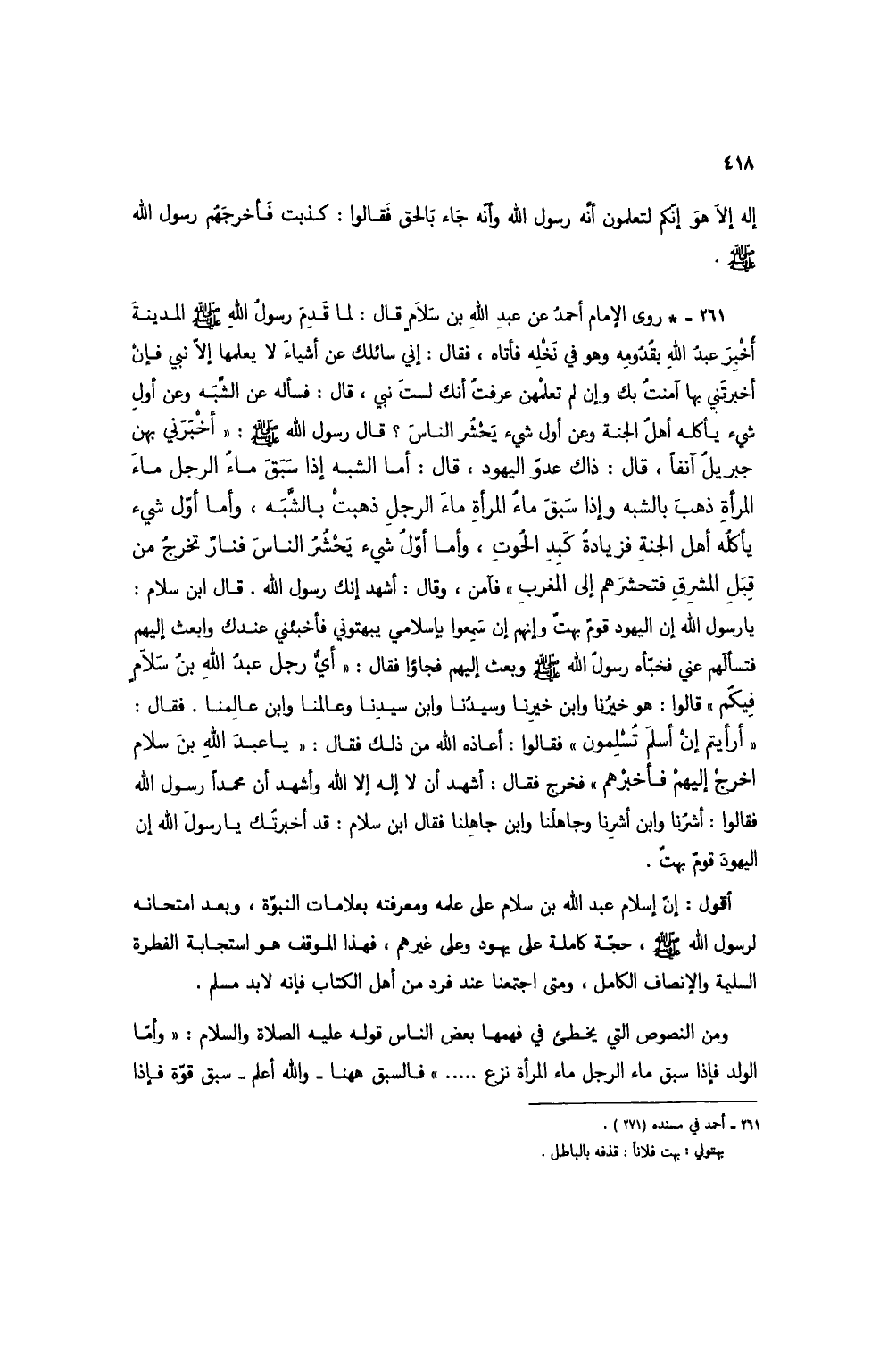 261 - * روى الإمام أحمدُ عن عبد الله بن سلام قال: لما قَدِمَ رسول الله صلى الله عليه وسلم المدينة أخبِرَ عبدُ الله بقدومه وهو في نخل فأتاه، فقال: إني سائلك عن أشياء لا يعلمها إلا نبي فإن أخبرتني بها آمنتُ بك وإن لم تعلمهن عرفتُ أنك لست نبي، قال: فسأله عن الشبه وعن أول شيء يأكله أهلُ الجنة وعن أول شيء يحشُر الناس؟ قال رسول الله صلى الله عليه وسلم: "أخبرني بهن جبريلُ آنفاً، قال: ذاك عدو اليهود، قال: أما الشبه إذا سبق ماءُ الرجل ماءَ المرأةِ ذهب بالشبه وإذا سبق ماءُ المرأة ماء الرجل ذهبت بالشبه، وأما أول شيء يأكله أهل الجنة فزيادةُ كبدٍ الحوتِ، وأما أول شيء يحشُرُ الناس فنارٌ تخرجُ من قِبَلِ المشرق فتحشرهم إلى المغرب" فآمن، وقال: أشهد إنك رسول الله. قال ابن سلام: يا رسول الله إن اليهود قومٌ بهتٌ وإنهم إن سمعوا بإسلامي يبهتوني فأخبئني عندك وابعث إليهم فتسألهم عني فخبأه رسول الله صلى الله عليه وسلم وبعث إليهم فجاؤوا فقال: "أيُّ رجل عبدُ الله بنُ سلامٍ فيكم" قالوا: هو خيرُنا وابن خيرنا وسيدنا وابن سيدنا وعالمنا وابن عالمنا. فقال: "أرأيتم إنْ أسلم تُسلمون" فقالوا: أعاذه الله من ذلك فقال: "يا عبد الله بن سلام اخرج إليهم فأخبرهم" فخرج فقال: أشهد أن لا إله إلا الله وأشهد أن محمداً رسول الله فقالوا: أشرُنا وابن أشرِنا وجاهلنا وابن جاهلنا فقال ابن سلام: قد أخبرتُك يا رسول الله إن اليهود قومُ بهتٌ.
