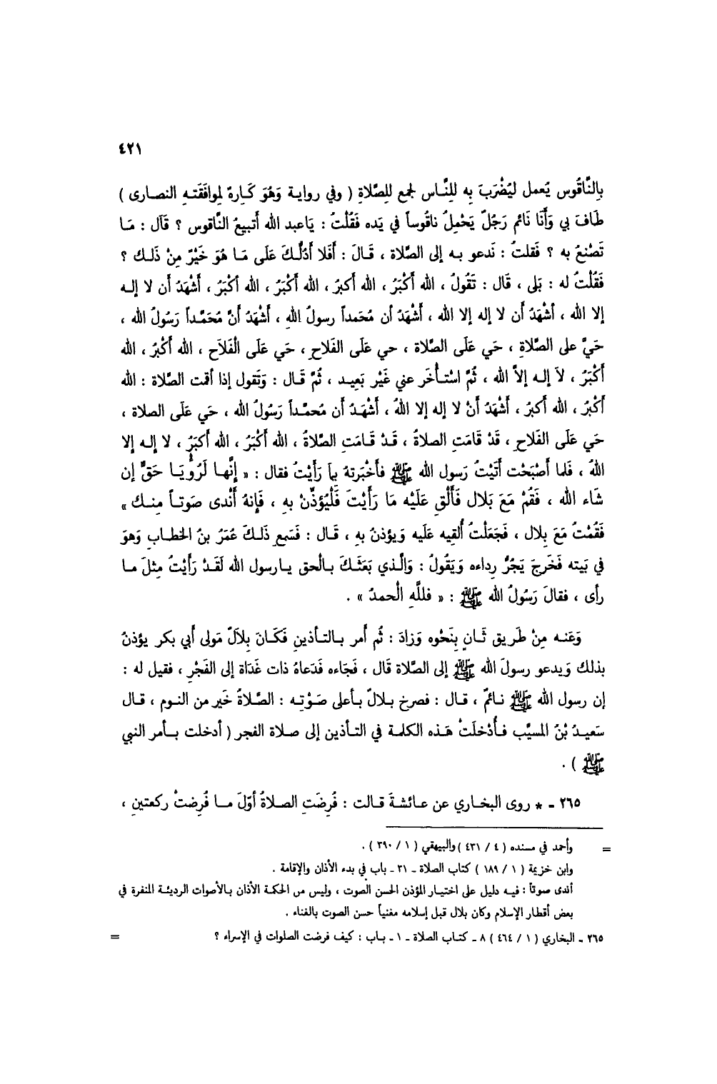 بالاناقُوس يُعمل ليضرب به للناس لجمع للصلاة (وفي رواية وهو كاره لموافقته النصارى) طاف بي وأنا نائم رجلٌ يحملُ ناقوساً في يده فقلتُ: يا عبد الله أتبيعُ الناقوس؟ قال: ما تصنع به؟ فقلتُ: ندعو به إلى الصلاة، قال: أفلا أدُلك على ما هو خير من ذلك؟ فقلت له: بلى، قال: تقول، الله أكبر، الله أكبر، الله أكبر، الله أكبرُ، أشهد ان لا إله إلا الله، أشهد ان لا إله إلا الله، أشهدُ أن محمداً رسول الله، أشهد أن محمداً رسول الله، حي على الصلاة، حي على الصلاة، حي على الفلاح، حي على الفلاح، الله أكبر، الله أكبر، لا إله إلا الله، ثم استأخر عني غير بعيد، ثم قال: وتقول إذا أقمت الصلاة: الله أكبر، الله أكبرُ، أشهدُ أن لا إله إلا الله، أشهد أن محمداً رسول الله، حي على الصلاة، حي على الفلاح، قد قامت الصلاةُ، قد قامت الصلاةُ، الله أكبرُ، الله أكبرُ، لا إله إلا الله، فلما أصبحت أتيتُ رسول الله صلى الله عليه وسلم فأخبرته بما رأيت فقال: "إنها لرؤيا حق إن شاء الله، فقم مع بلال فألق عليه ما رأيت فليؤذن به، فإنه أندى صوتاً منك" فقمت مع بلال، فجعلتُ ألقيه عليه ويؤذنُ به، قال: فسمع ذلك عمر بن الخطاب وهو في بيته فخرج يجرُّ رداءه ويقول: والذي بعثك بالحق يا رسول الله لقد رأيتُ مثل ما رأى، فقال رسول الله صلى الله عليه وسلم: "فلله الحمدُ".