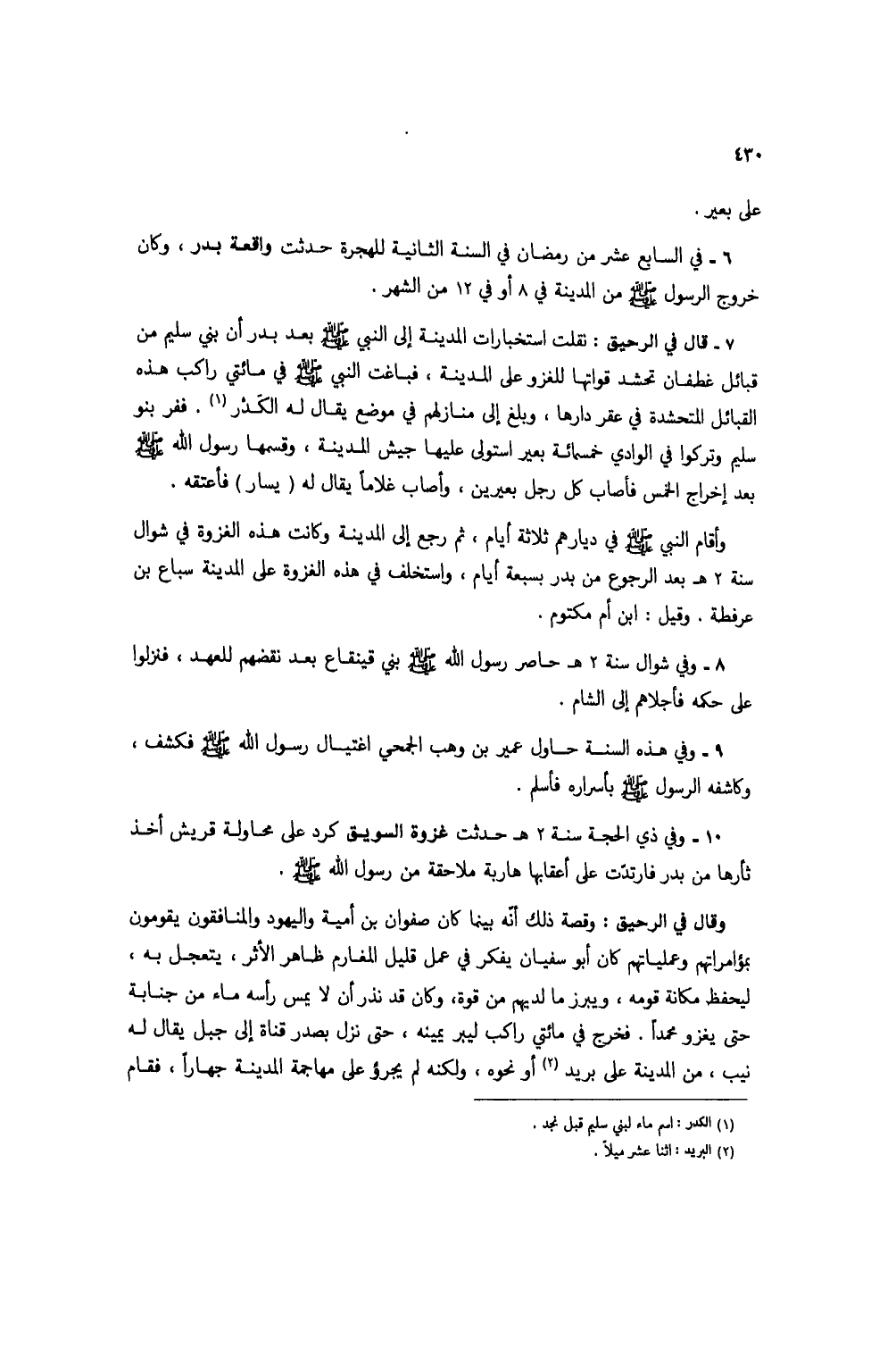7 - قال في الرحيق: نقلت استخبارات المدينة إلى النبي صلى الله عليه وسلم بعد بدر أن بني سليم من قبائل غطفان تحشد قواتها للغزو على المدينة، فباغت النبي صلى الله عليه وسلم في مائتي راكب هذه القبائل المتحشدة في عقر دارها، وبلغ إلى منازلهم في موضع يقال له الكَدْر (1). ففر بنو سليم وتركوا في الوادي خمسمائة بعير استولى عليها جيش المدينة، وقسمها رسول الله صلى الله عليه وسلم بعد إخراج الخمس فأصاب كل رجل بعيرين، وأصاب غلاماً يقال له (يسار) فأعتقه.