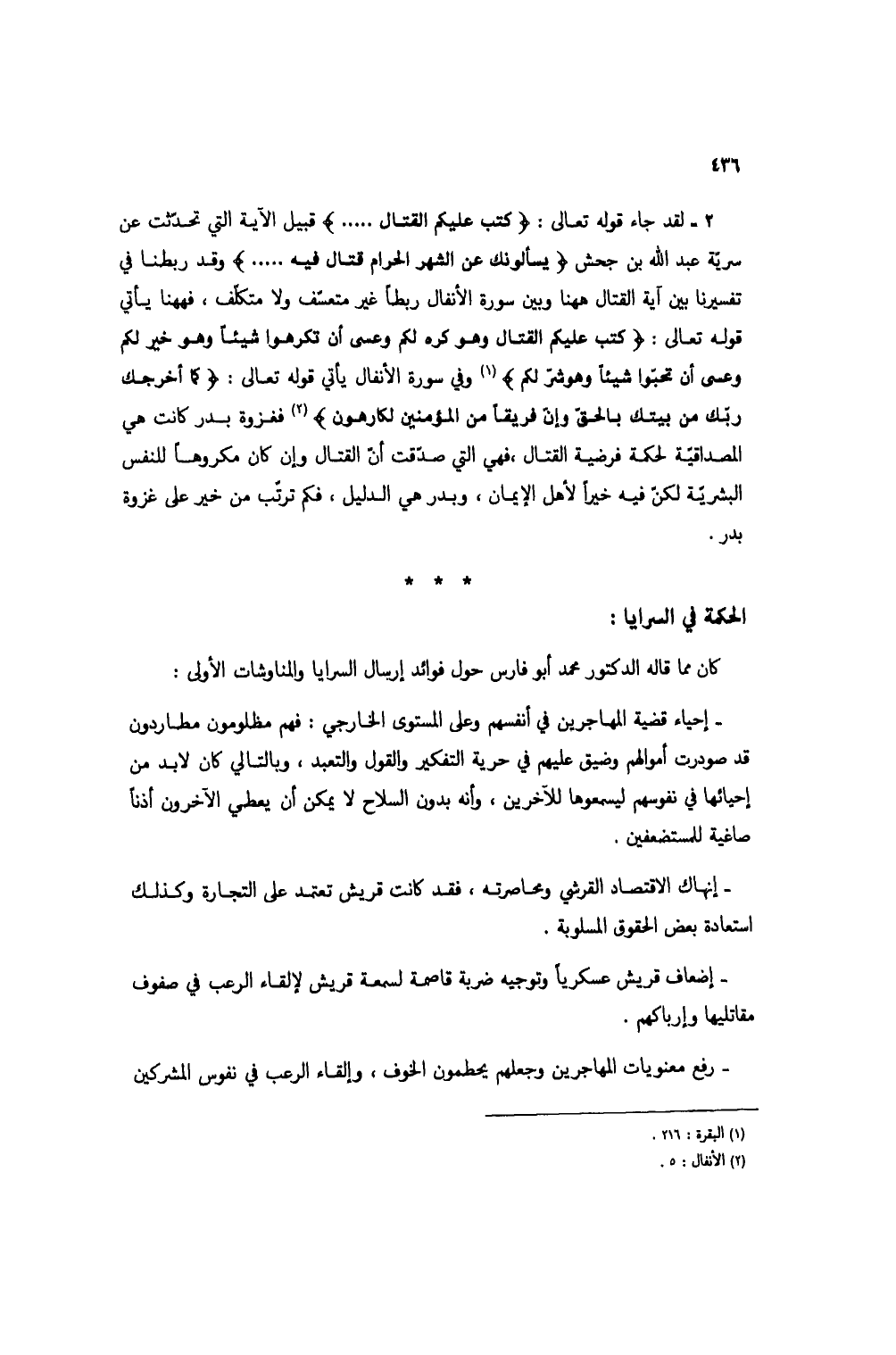3 - لقد جاء قوله تعالى: {كُتِبَ عَلَيْكُمُ الْقِتَالُ} قبيل الآية التي تحدثت عن سرية عبد الله بن جحش {يَسْأَلُونَكَ عَنِ الشَّهْرِ الْحَرَامِ} وقد ربطنا في تفسيرنا بين آية القتال ههنا وبين سورة الأنفال ربطاً غير متعسف ولا متكلف، فههنا يأتي قوله تعالى: {كُتِبَ عَلَيْكُمُ الْقِتَالُ وَهُوَ كُرْهٌ لَكُمْ وَعَسَى أَنْ تَكْرَهُوا شَيْئًا وَهُوَ خَيْرٌ لَكُمْ وَعَسَى أَنْ تُحِبُّوا شَيْئًا وَهُوَ شَرٌّ لَكُمْ} (1) وفي سورة الأنفال يأتي قوله تعالى: {كَمَا أَخْرَجَكَ رَبُّكَ مِنْ بَيْتِكَ بِالْحَقِّ وَإِنَّ فَرِيقًا مِنَ الْمُؤْمِنِينَ لَكَارِهُونَ} (2) فغزوة بدر كانت هي المصداقية لحكمة فرضية القتال، فهي التي صدقت أن القتال وإن كان مكروهاً للنفس البشرية لكن فيه خيراً لأهل الإيمان، وبدر هي الدليل، فكم ترتب من خير على غزوة بدر.