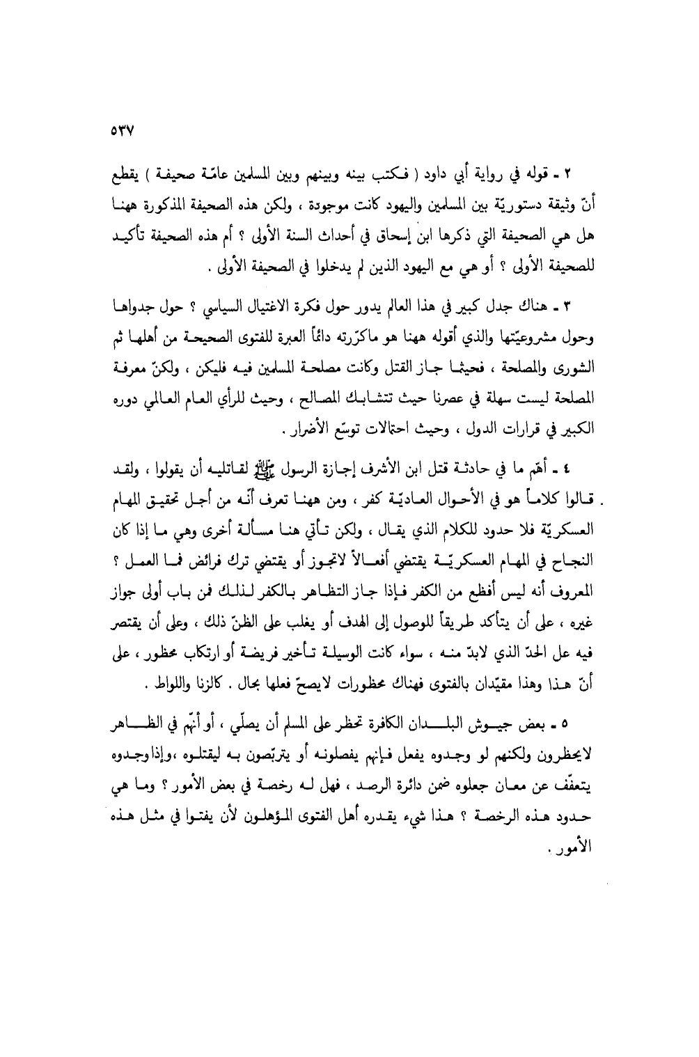 2 - قوله في رواية أبي داود (فكتب بينه وبينهم وبين المسلمين عامة صحيفة) يقطع أن وثيقة دستورية بين المسلمين واليهود كانت موجودة، ولكن هذه الصحيفة المذكورة ههنا هل هي الصحيفة التي ذكرها ابن إسحاق في أحداث السنة الأولى؟ أم هذه الصحيفة تأكيد للصحيفة الأولى؟ أو هي مع اليهود الذين لم يدخلوا في الصحيفة الأولى.