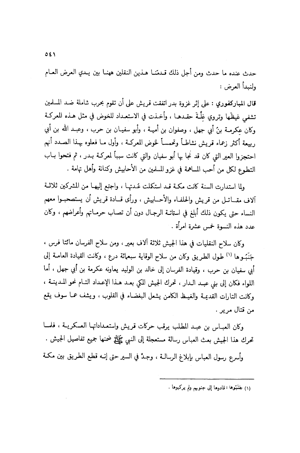 وكان سلاح النقليات في هذا الجيش ثلاثة آلاف بعير، ومن سلاح الفرسان مائتا فرس، جنبوها (1) طول الطريق وكان من سلاح الوقاية سبعمائة درع، وكانت القيادة العامة إلى أبي سفيان بن حرب، وقيادة الفرسان إلى خالد بن الوليد يعاونه عكرمة بن أبي جهل، أما اللواء فكان إلى بني عبد الدار، تحرك الجيش المكي بعد هذا الإعداد التام نحو المدينة، وكانت التارات القديمة والغيظ الكامن يشعل البغضاء في القلوب، ويشف عما سوف يقع من قتال مرير.