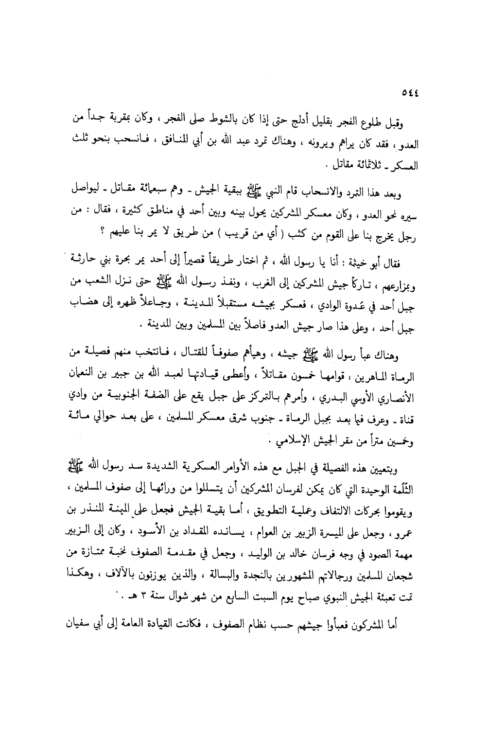 فقال أبو خيثمة: أنا يا رسول الله، ثم اختار طريقاً قصيراً إلى أحد يمر بحرة بني حارثة وبمزارعهم، تاركاً جيش المشركين إلى الغرب، ونفذ رسول الله صلى الله عليه وسلم حتى نزل الشعب من جبل أحد في عدوة الوادي، فعسكر بجيشه مستقبلاً المدينة، وجاعلاً ظهره إلى هضاب جبل أحد، وعلى هذا صار جيش العدو فاصلاً بين المسلمين وبين المدينة.