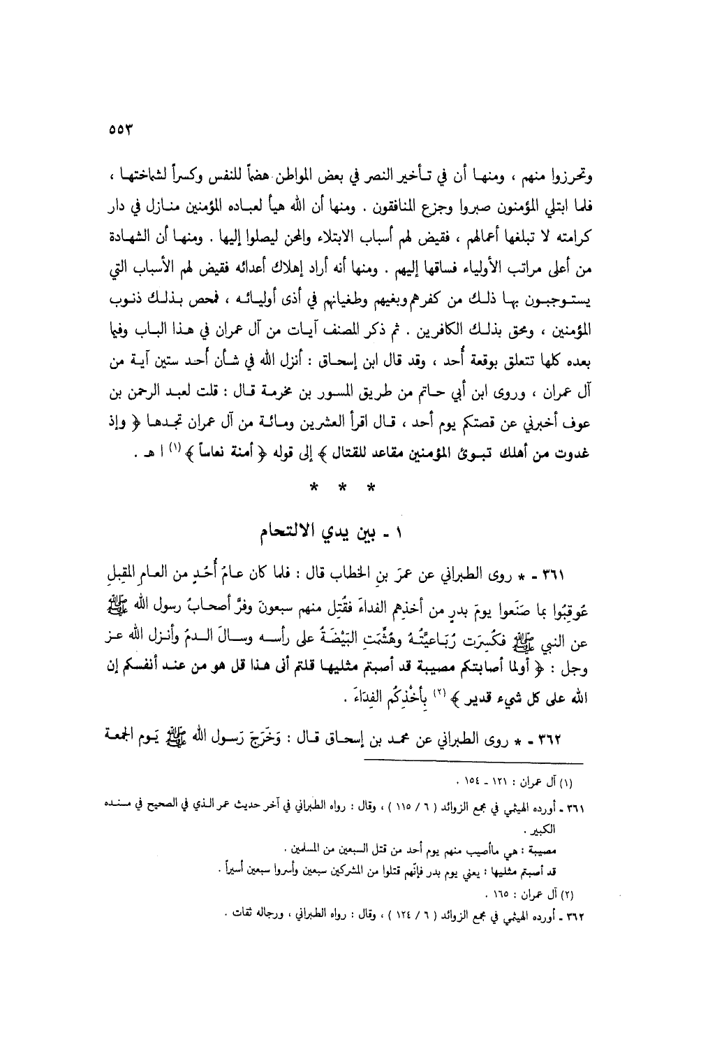 361 - *روى الطبراني عن عمر بن الخطاب قال: فلما كان عام أحد من العام المقبل عوقبوا بما صنعوا يوم بدر من أخذهم الفداء فقتل منهم سبعون وفر أصحاب رسول الله صلى الله عليه وسلم عن النبي صلى الله عليه وسلم فكسرت رباعيته وهشمت البيضة على رأسه وسال الدم وأنزل الله عز وجل: (أولما أصابتكم مصيبة قد أصبتم مثليها قلتم أنى هذا قل هو من عند أنفسكم إن الله على كل شيء قدير) (2) بأخذكم الفداء.
