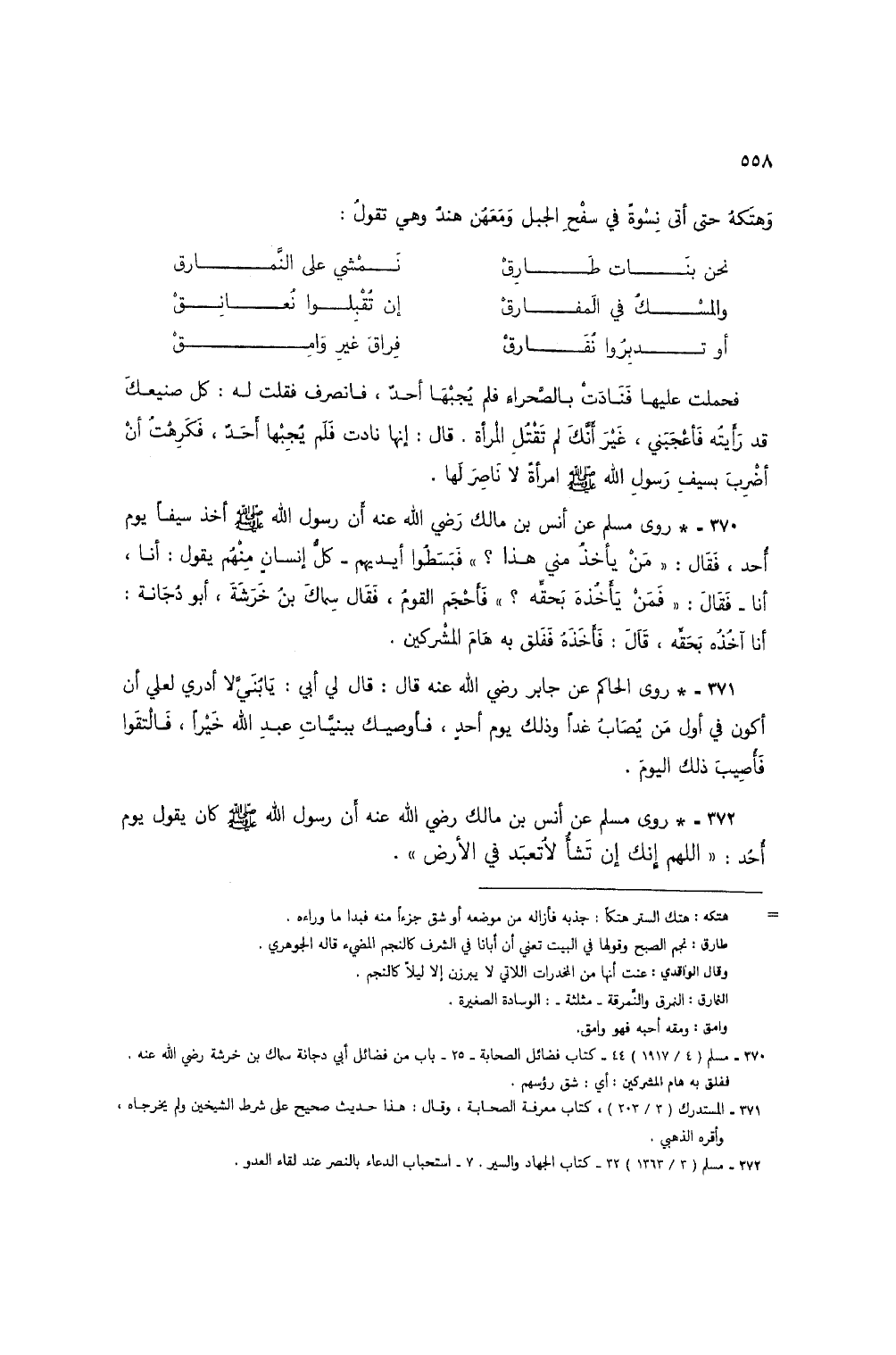 370 - * روى مسلم عن أنس بن مالك رضي الله عنه أن رسول الله صلى الله عليه وسلم أخذ سيفاً يوم أحد، فقال: "من يأخذ مني هذا؟ " فبسطوا أيديهم - كل إنسان منهم يقول: أنا، أنا - فقال: "فمن يأخذه بحقه؟ " فأحجم القوم، فقال سماك بن خرشة، أبو دجانة: أنا آخذه بحقه، قال: فأخذه ففلق به هام المشركين.