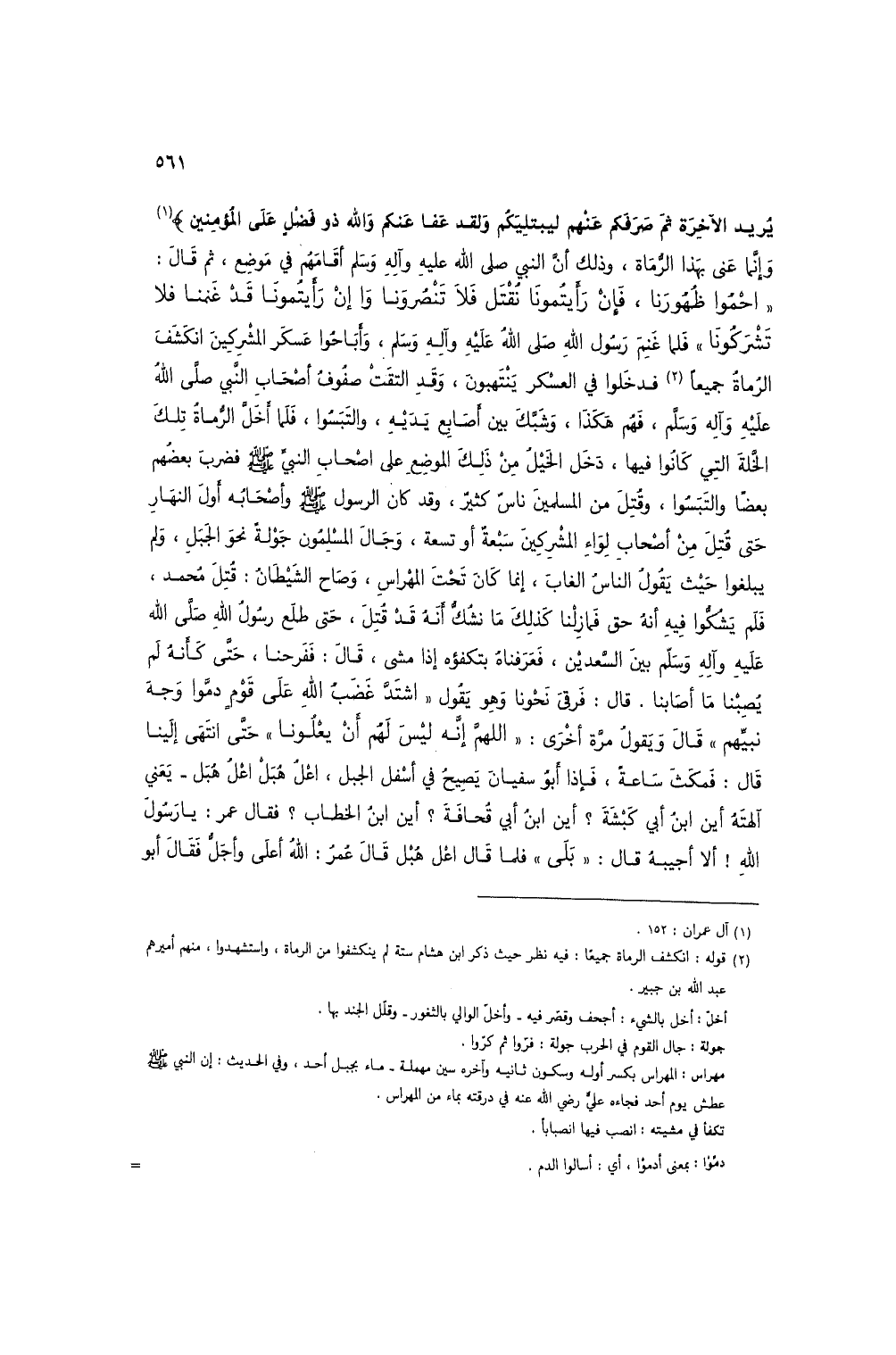 يريد الآخرة ثم صرفكم عنهم ليبتليكم ولقد عفا عنكم والله ذو فضل على المؤمنين) (1) وإنما عنى بهذا الرماة، وذلك أن النبي صلى الله عليه وآله وسلم أقامهم في موضع، ثم قال: "احموا ظهورنا، فإن رأيتمونا نقتل فلا تنصرونا وإن رأيتمونا قد غنمنا فلا تشركونا" فلما غنم رسول الله صلى الله عليه وآله وسلم، وأباحوا عسكر المشركين انكشف الرماة جميعاً (2) فدخلوا في العسكر ينتهبون، وقد التقت صفوف أصحاب النبي صلى الله عليه وآله وسلم، فهم هكذا، وشبك بين أصابع يديه، والتبسوا، فلما أخل الرماة تلك الخلة التي كانوا فيها، دخل الخيل من ذلك الموضع على أصحاب النبي صلى الله عليه وسلم فضرب بعضهم بعضاً والتبسوا، وقتل من المسلمين ناس كثير، وقد كان الرسول صلى الله عليه وسلم وأصحابه أول النهار حتى قتل من أصحاب لواء المشركين سبعة أو تسعة، وجال المسلمون جولة نحو الجبل، ولم يبلغوا حيث يقول الناس الغاب، إنما كان تحت المهراس، وصاح الشيطان: قتل محمد، فلم يشكوا فيه أنه حق فما زلنا كذلك ما نشك أنه قد قتل، حتى طلع رسول الله صلى الله عليه وآله وسلم بين السعدين، فعرفناه بتكفؤه إذا مشى، قال: ففرحنا، حتى كأنه لم يصبنا ما أصابنا. قال: فرقى نحونا وهو يقول "اشتد غضب الله على قوم دموا وجه نبيهم" قال ويقول مرة أخرى: "اللهم إنه ليس لهم أن يعلونا" حتى انتهى إلينا قال: فمكث ساعة، فإذا أبو سفيان يصيح في أسفل الجبل، اعل هبل اعل هبل - يعني آلهته أين ابن أبي كبشة؟ أين ابن أبي قحافة؟ أين ابن الخطاب؟ فقال عمر: يا رسول الله! ألا أجيبه قال: "بلى" فلما قال اعل هبل قال عمر: الله أعلى وأجل فقال أبو