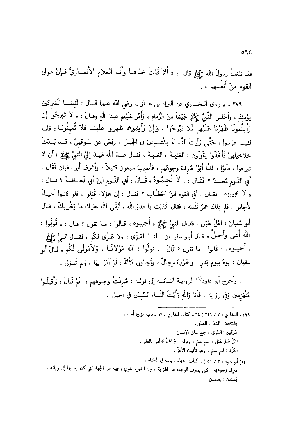 379 - * روى البخاري عن البراء بن عازب رضي الله عنهما قال: لقينا المشركين يومئذ، وأجلس النبي صلى الله عليه وسلم جيشاً من الرماة، وأمر عليهم عبد الله وقال: "لا تبرحوا إن رأيتمونا ظهرنا عليهم فلا تبرحوا، وإن رأيتموهم ظهروا علينا فلا تعينونا" فلما لقينا هربوا، حتى رأيت النساء يتشددن في الجبل، رفعن عن سوقهن، قد بدت خلاخيلهن فأخذوا يقولون: الغنيمة، الغنيمة، فقال عبد الله عهد إلي النبي صلى الله عليه وسلم: أن لا تبرحوا، فأبوا، فلما أبوا صرف وجوههم، فأصيب سبعون قتيلاً، وأشرف أبو سفيان فقال: أفي القوم محمد؟ فقال: "لا تجيبوه" قال: أفي القوم ابن أبي قحافة؟ قال: "لا تجيبوه" فقال: أفي القوم ابن الخطاب؟ فقال: إن هؤلاء قتلوا، فلو كانوا أحياء لأجابوا، فلم يملك عمر نفسه، فقال كذبت يا عدو الله، أبقى الله عليك ما يخريك، قال أبو سفيان: اعل هبل. فقال النبي صلى الله عليه وسلم "أجيبوه" قالوا: ما نقول؟ قال: "قولوا: الله أعلى وأجل" قال أبو سفيان: لنا العزى، ولا عزى لكم، فقال النبي صلى الله عليه وسلم: "أجيبوه". قالوا: ما نقول؟ قال: "قولوا: الله مولانا، ولا مولى لكم" قال أبو سفيان: يوم بيوم بدر، والحرب سجال، وتجدون مثلة، لم آمر بها، ولم تسؤني.