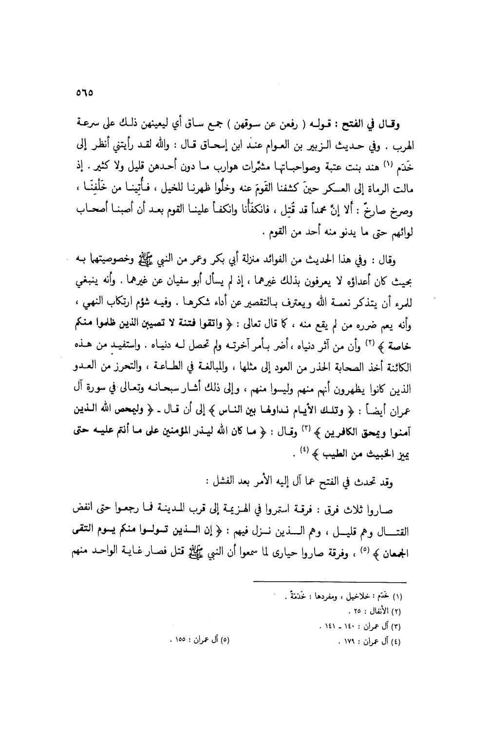وقال في الفتح: قوله (رفعن عن سوقهن) جمع ساق أي ليعينهن ذلك على سرعة الهرب. وفي حديث الزبير بن العوام عند ابن إسحاق قال: والله لقد رأيتني أنظر إلى خدم (1) هند بنت عتبة وصواحباتها مشمرات هوارب ما دون أحدهن قليل ولا كثير. إذ مالت الرماة إلى العسكر حين كشفنا القوم عنه وخلوا ظهرنا للخيل، فأتينا من خلفنا، وصرخ صارخ: ألا إن محمداً قد قتل، فانكفأنا وانكفأ علينا القوم بعد أن أصبنا أصحاب لوائهم حتى ما يدنو منه أحد من القوم.