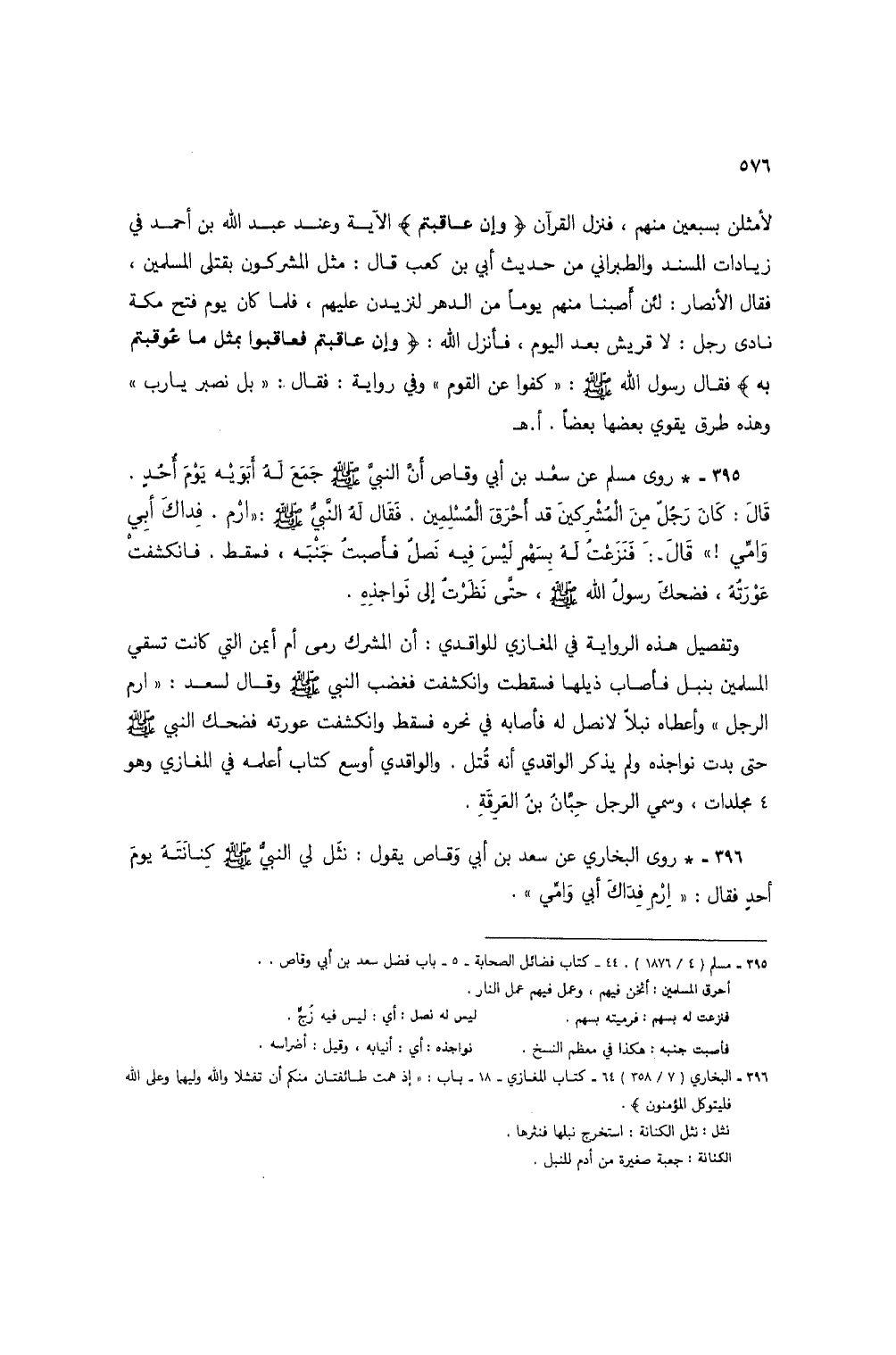 396 - * روى البخاري عن سعد بن أبي وقاص يقول: نثل لي النبي صلى الله عليه وسلم كنانته يوم أحد فقال: "ارم فداك أبي وأمي".