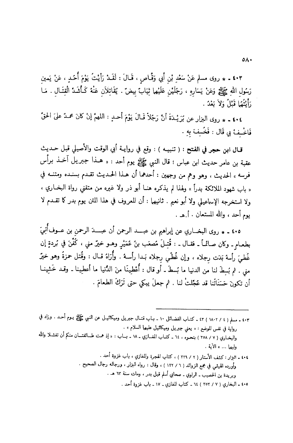 403 - * روى مسلم عن سعد بن أبي وقاص، قال: لقد رأيت يوم أحد، عن يمين رسول الله صلى الله عليه وسلم وعن يساره، رجلين عليهما ثياب بيض. يقاتلان عنه كأشد القتال. ما رأيتهما قبل ولا بعد.